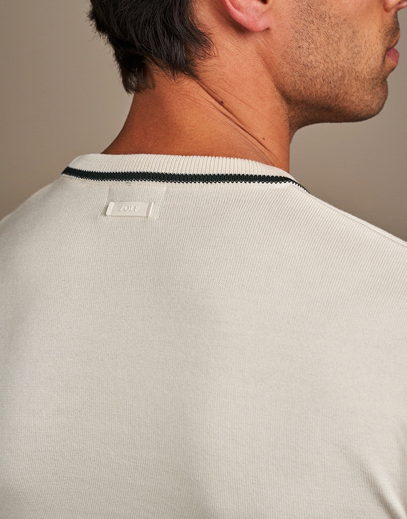 T-shirt de malha em tom cru da Zolf, confecionada em 50% algodão e 50% modal, proporcionando um toque extremamente suave, respirável e confortável ao longo do dia.