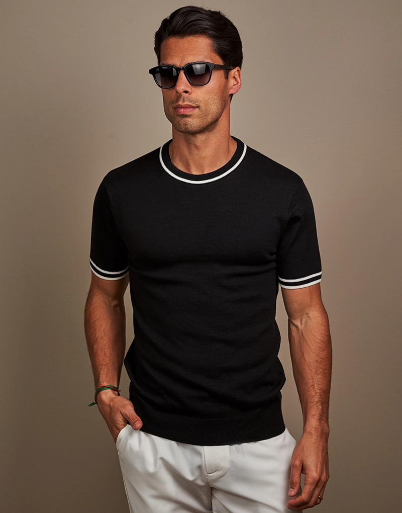 O corte ajustado ao corpo realça a silhueta masculina com elegância, enquanto os acabamentos canelados na gola e mangas com contraste criam um efeito bicolor discreto e sofisticado.