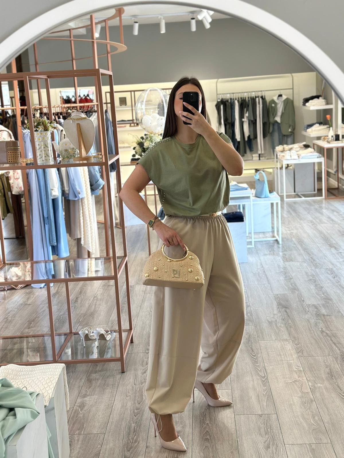 O destaque vai para as aplicações metálicas, que criam um efeito visual marcante e acrescentam atitude à peça, sem comprometer a sua versatilidade. Este detalhe confere-lhe um lado mais irreverente, ideal para elevar coordenados simples.