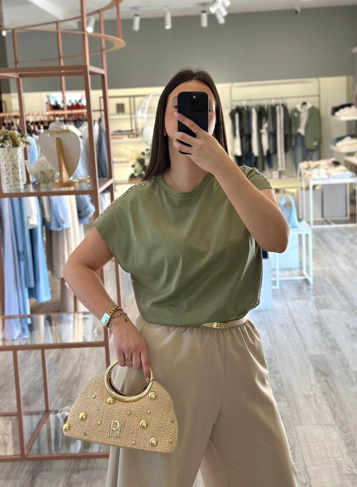 T-SHIRT VERDE COM APLICAÇÕES METÁLICAS PONTO CHIC