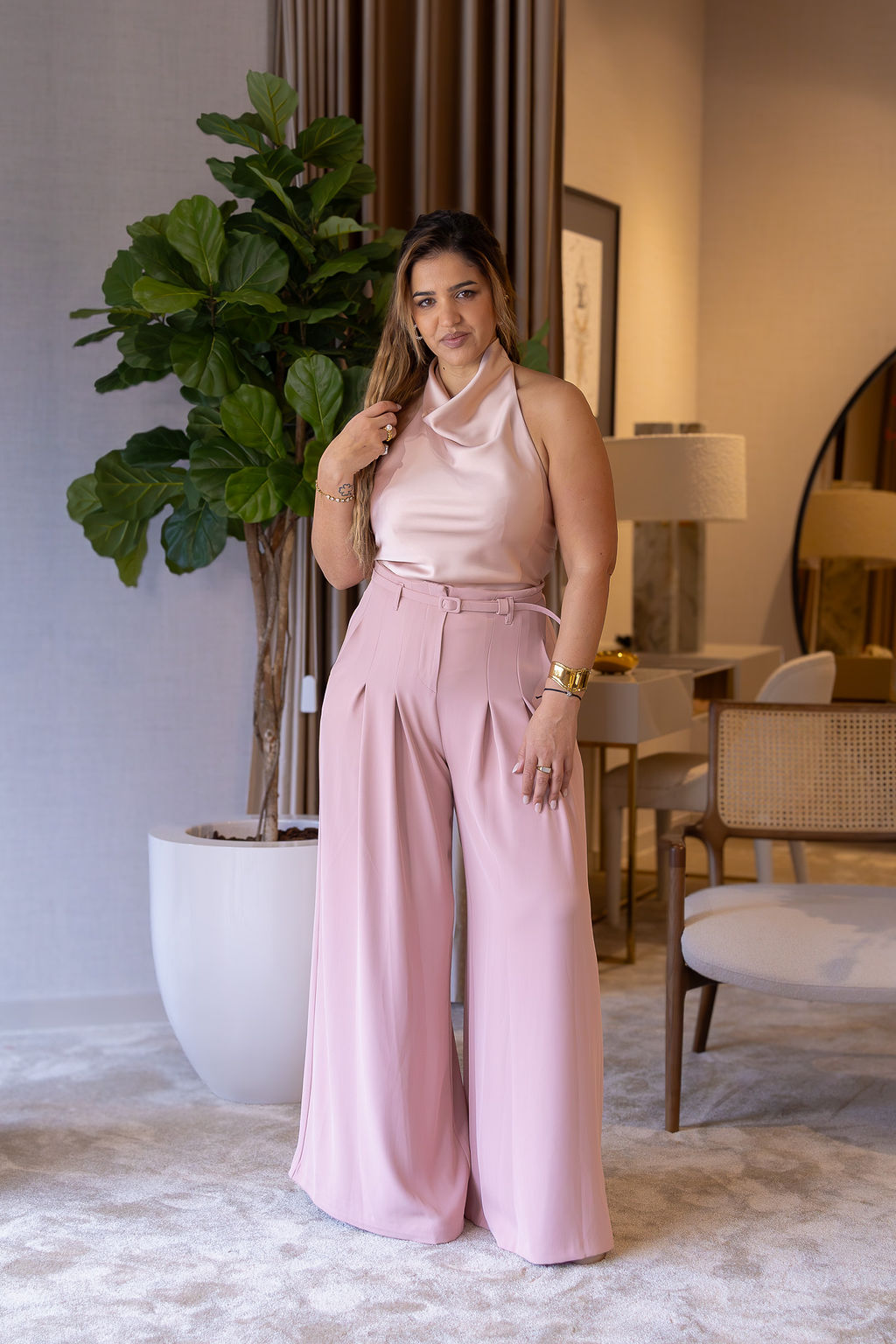 Apresenta decote drapeado à frente, que cria um efeito delicado e feminino, enquanto o corte sem mangas alonga a silhueta. Na parte de trás, o top fecha com botões forrados no mesmo tom, garantindo um acabamento cuidado e harmonioso.