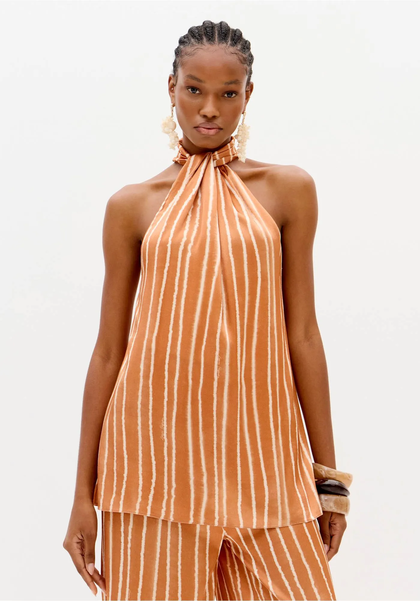Este top acetinado em tom caramelo com padrão de riscas destaca-se pela sua elegância fluida e pelo detalhe distintivo no pescoço. Confeccionado em 100% viscose, apresenta um tecido leve, suave ao toque e com brilho subtil que valoriza o caimento da peça.