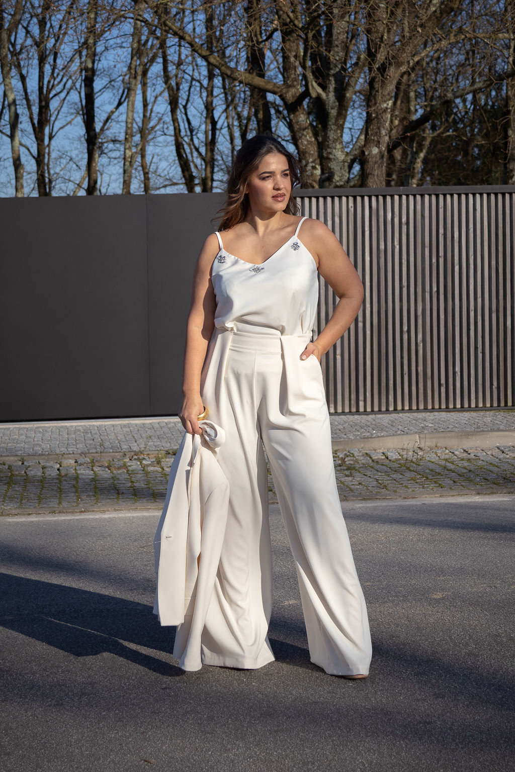 Minimalista com um toque de brilho. Este top creme destaca-se pelo corte fluido e pelo decote delicado, enriquecido com aplicações brilhantes que acrescentam sofisticação na medida certa. As alças finas ajustáveis permitem um encaixe perfeito, enquanto a queda suave do tecido cria uma silhueta leve e elegante. É uma peça versátil que funciona tanto em coordenados mais formais com blazer ou alfaiataria, como em looks descontraídos com denim para um contraste moderno.