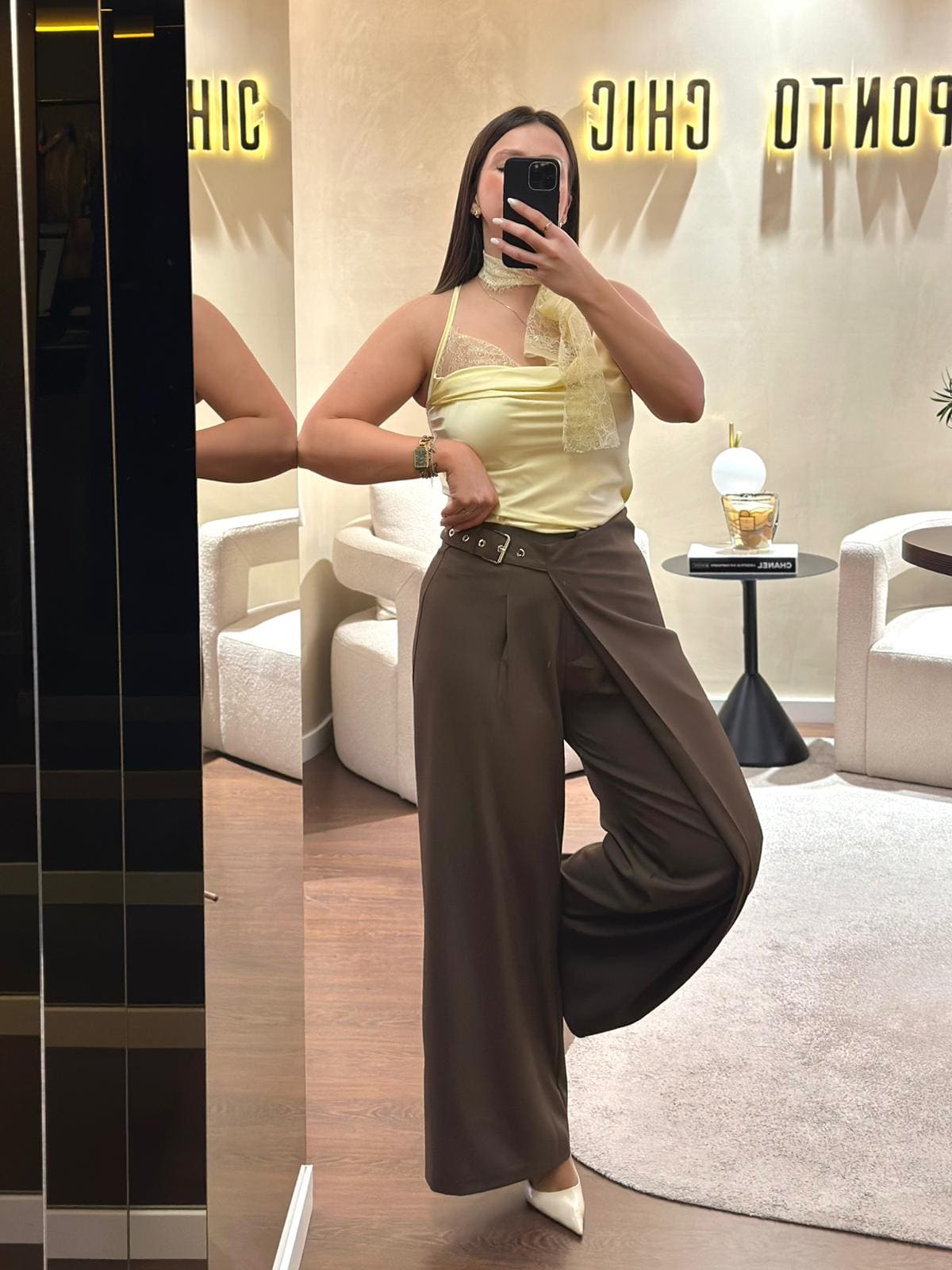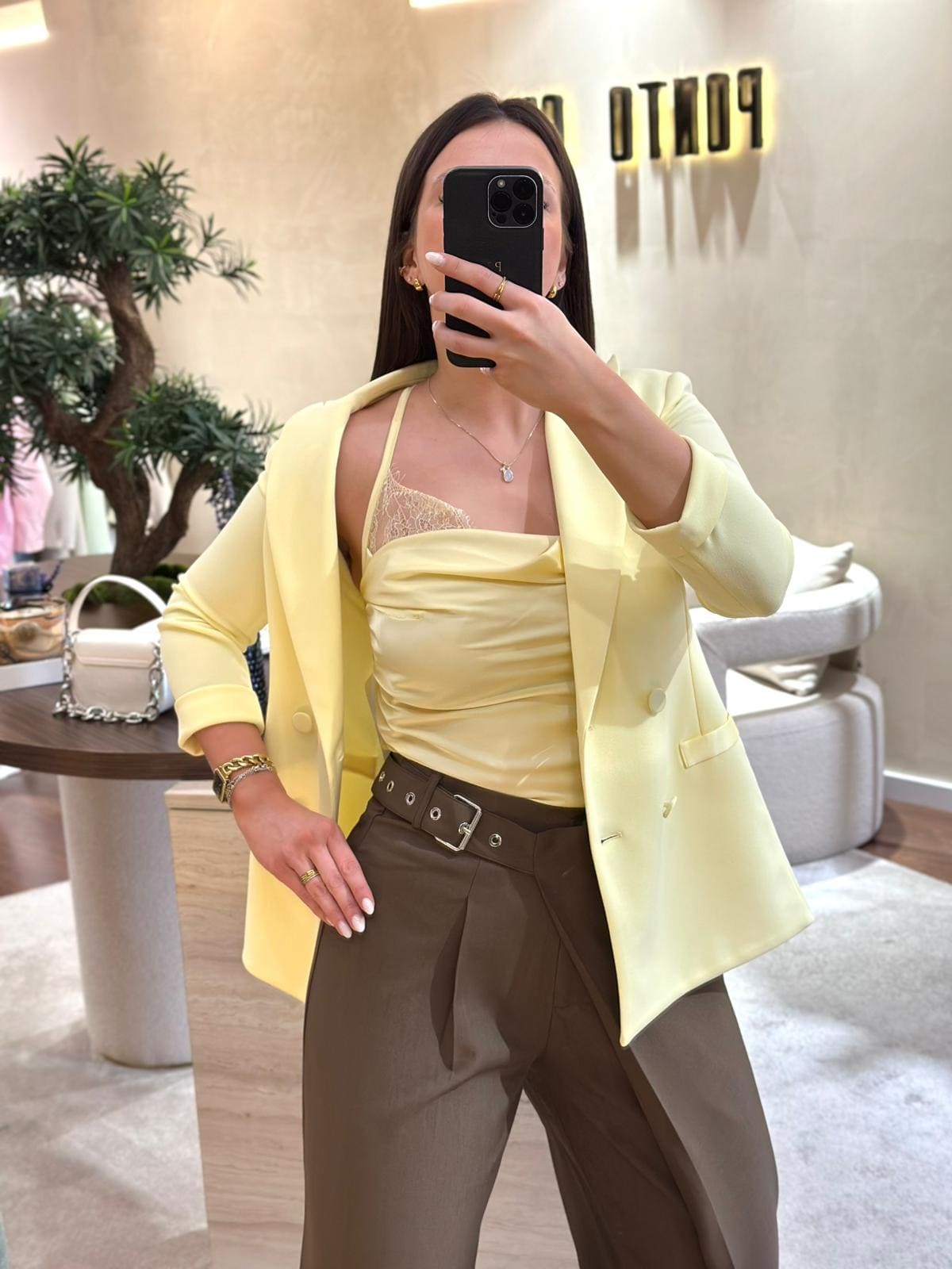 Top em tom amarelo suave com acabamento acetinado, que se destaca pela sua elegância delicada e feminina. O decote fluido cria um efeito sofisticado e valoriza o colo de forma subtil.