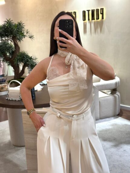 TOP BEGE ACETINADO COM DETALHE CHOKER EM RENDA PONTO CHIC