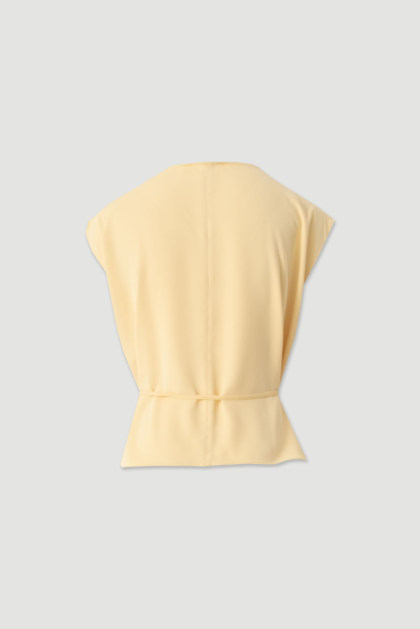 Top em tom amarelo claro, leve e luminoso, ideal para looks elegantes e femininos nos dias mais quentes. Confeccionado em tecido fluido 100% poliéster, apresenta um cair suave que valoriza o movimento da peça e cria um efeito delicado e sofisticado. Destaca-se pelo decote drapeado, que cria um efeito natural de fluidez na zona do peito, conferindo elegância e um toque contemporâneo ao design. As mangas curtas amplas acrescentam leveza à silhueta e garantem conforto ao longo do dia.