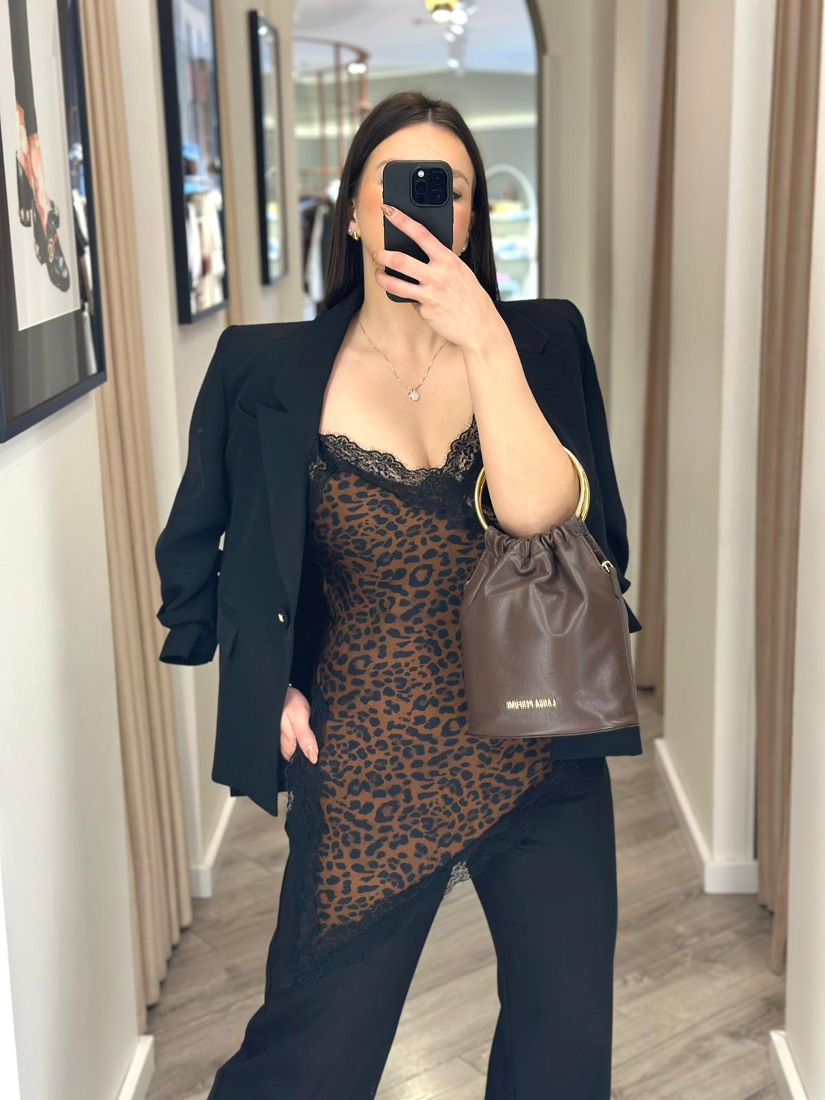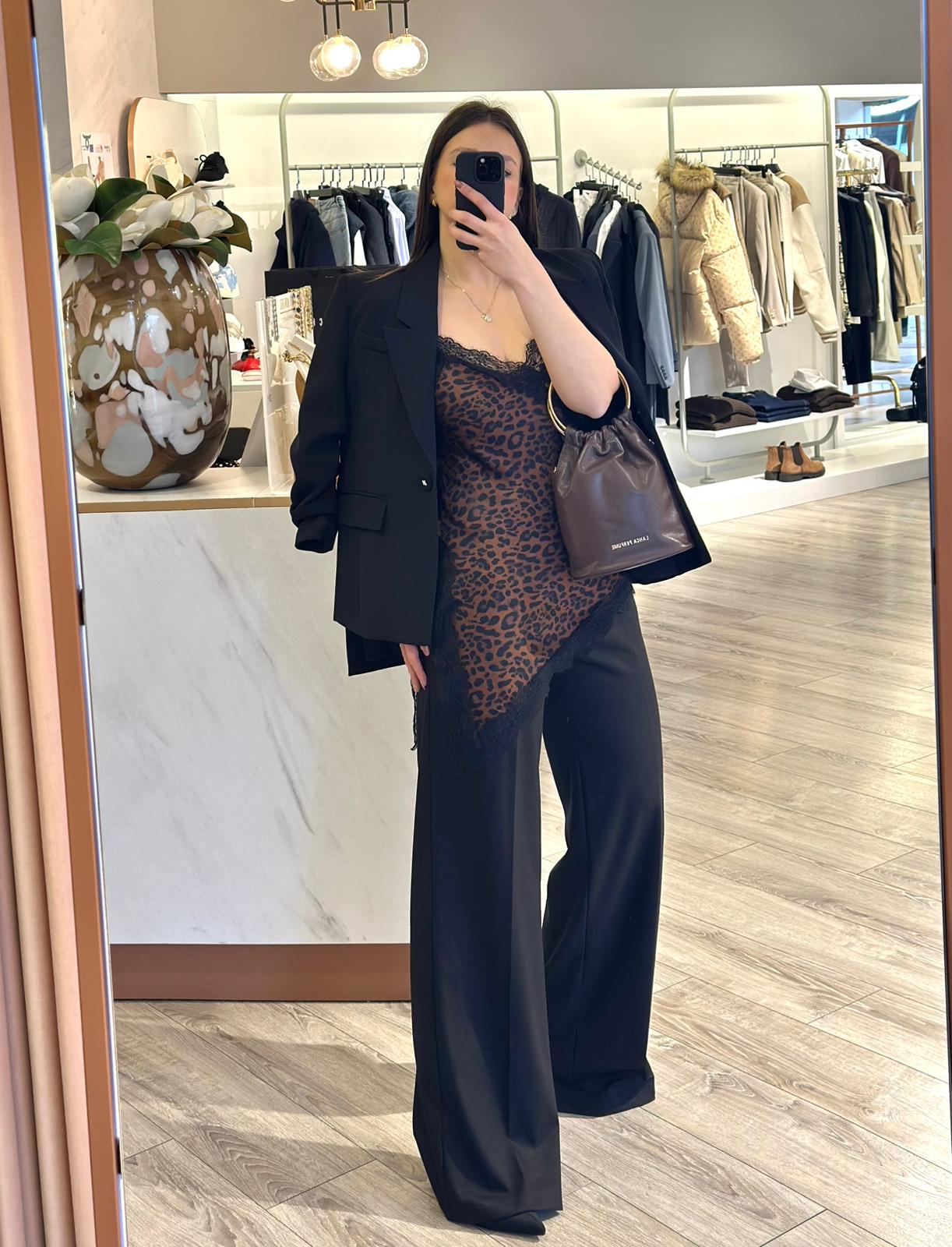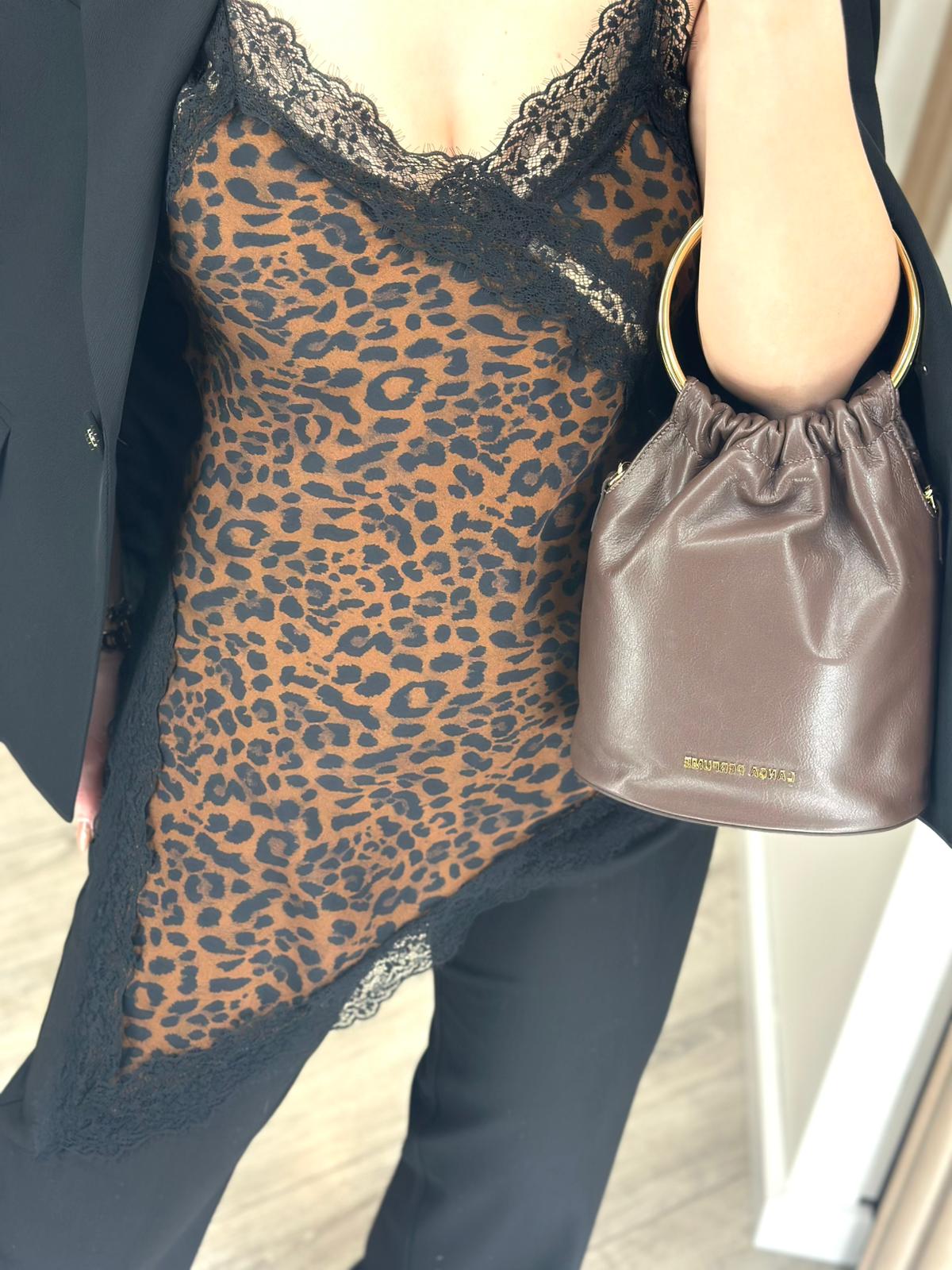 O padrão leopardo em tons de castanho e preto acrescenta personalidade e atitude, transformando este top num essencial moderno e irresistível.