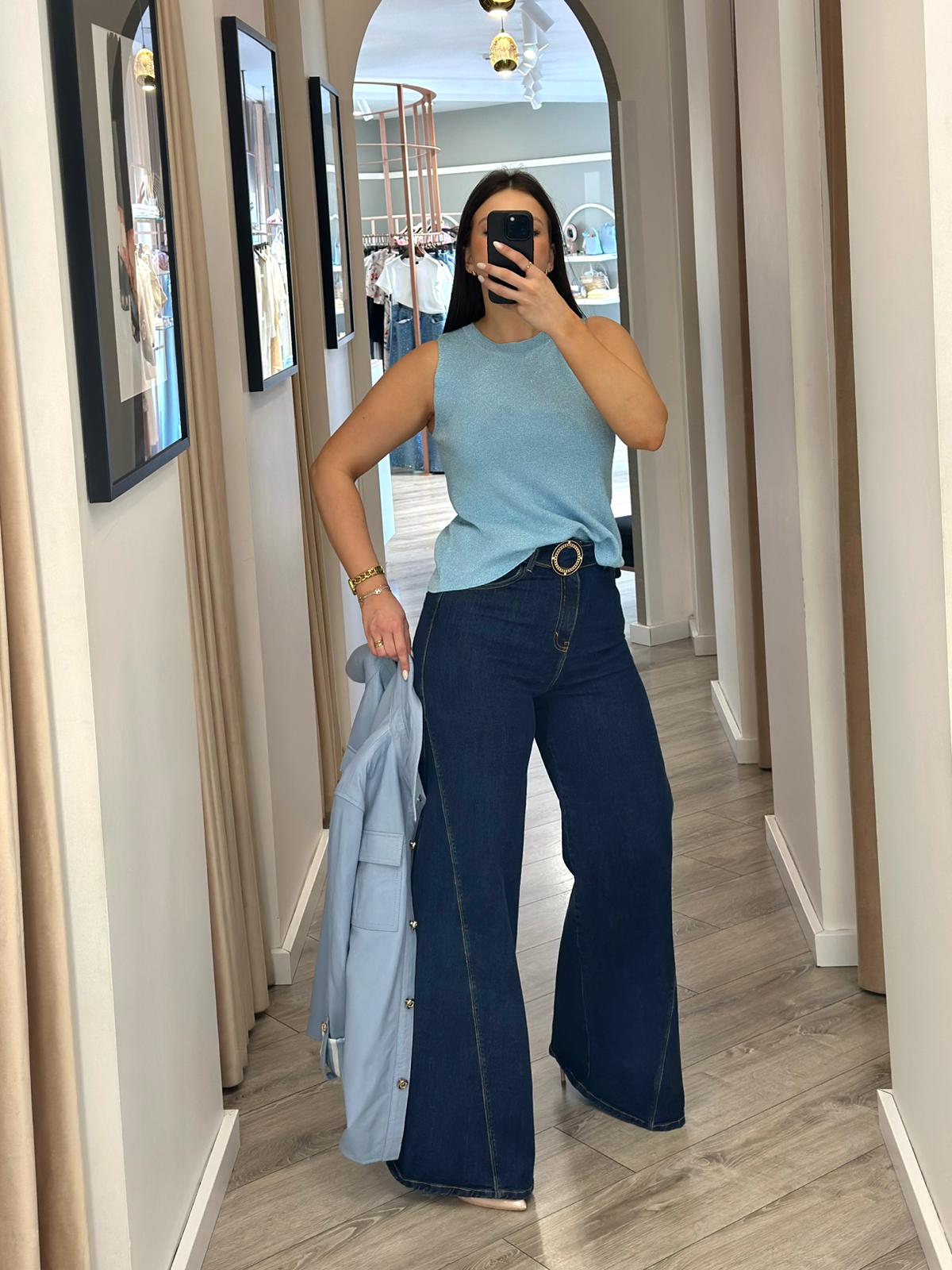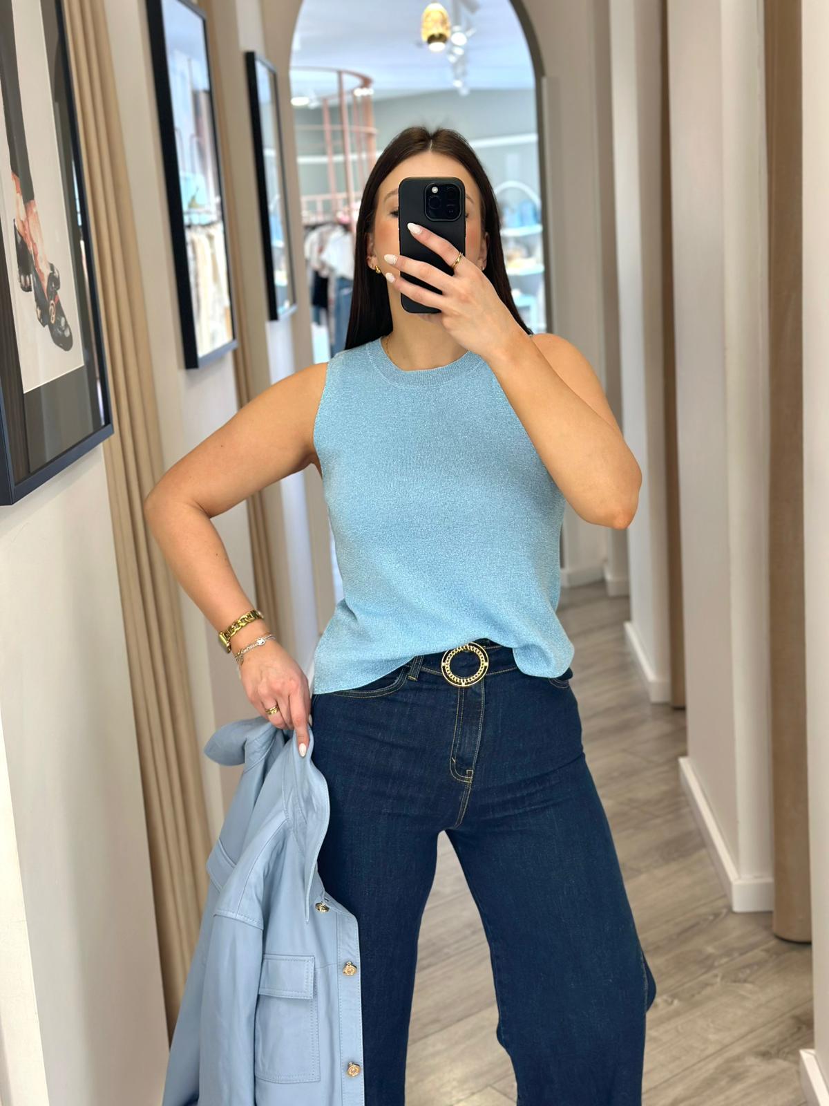 Moderno e sofisticado, este top azul destaca-se pelo seu brilho subtil que capta a luz de forma elegante. Uma peça que traz frescura e personalidade ao look.