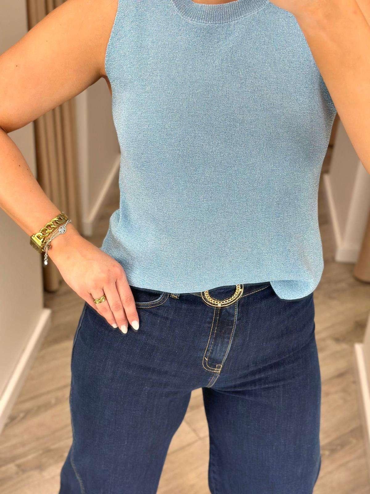 TOP AZUL BRILHO SEM MANGAS PONTO CHIC