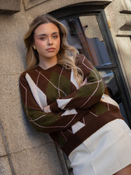 CAMISOLA DE MALHA CASTANHA COM PADRÃO LOSANGOS PONTO CHIC