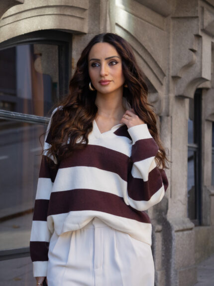 POLO DE MALHA ÀS RISCAS CRU E CASTANHO PONTO CHIC