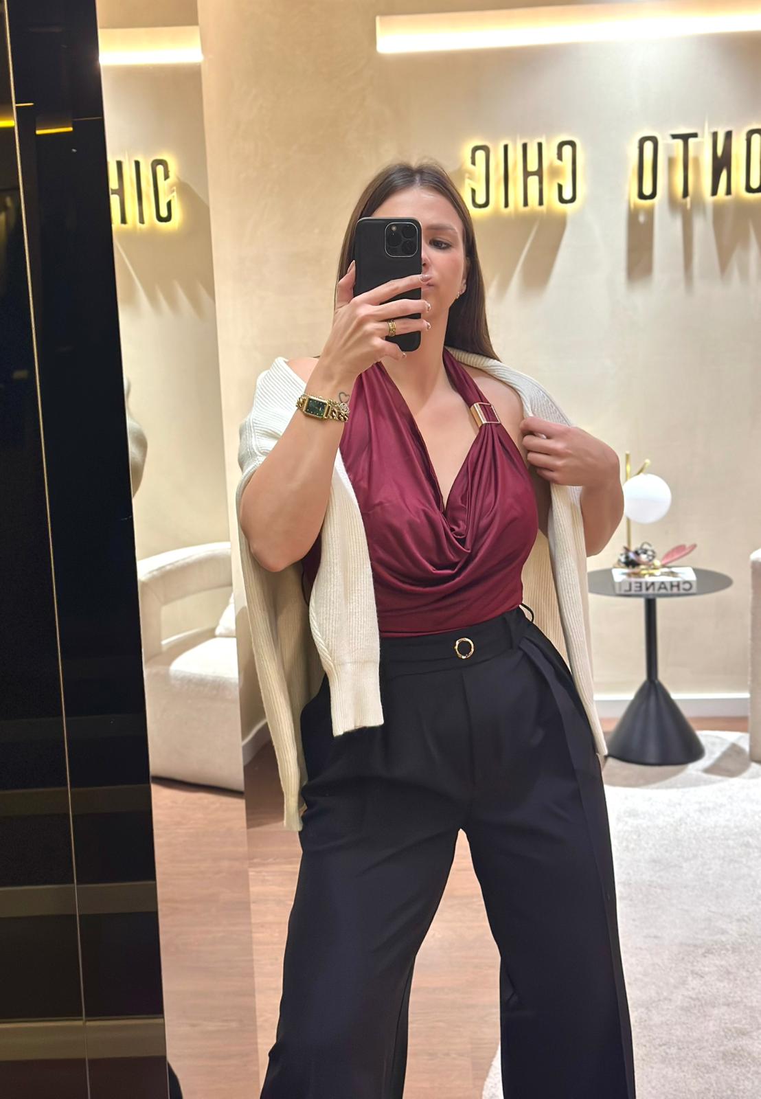 TOP BORDÔ DE GOLA HALTER COM DETALHE DOURADO PONTO CHIC