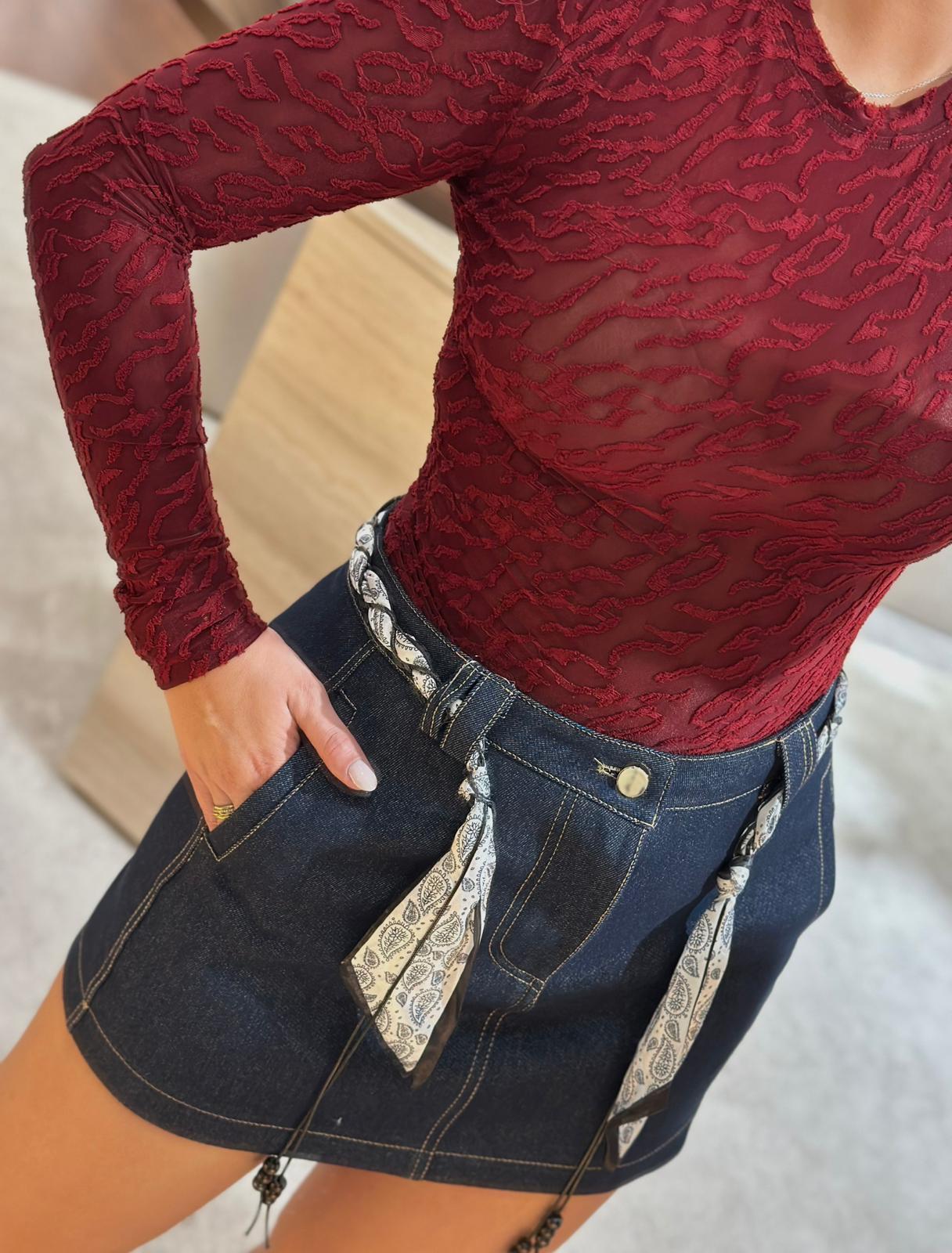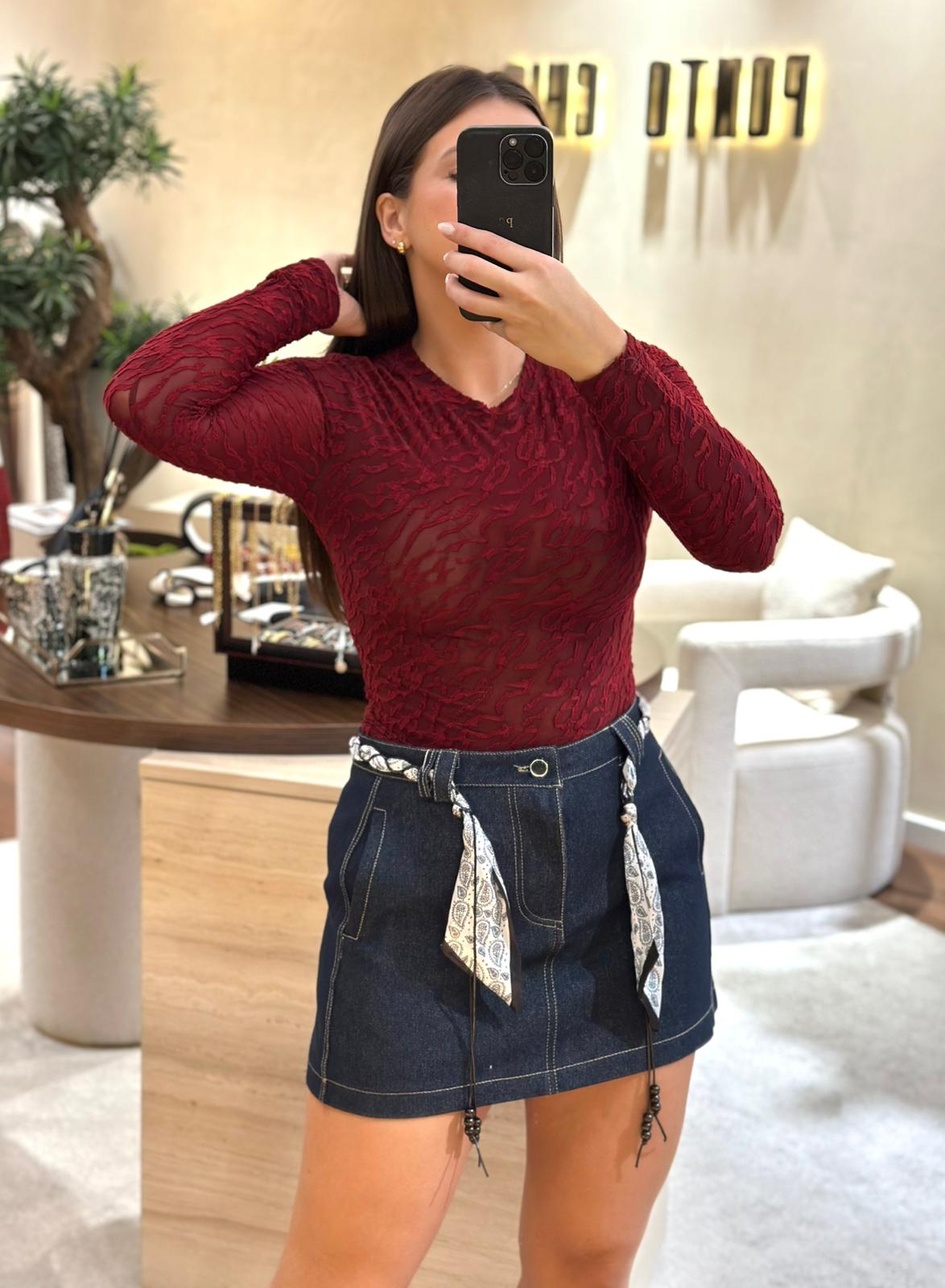 O design distingue-se pelo tecido transparente com textura em relevo, que acrescenta profundidade e um detalhe visual único. A cor bordô intensifica o charme e a ousadia da peça, enquanto as mangas compridas e o corte justo garantem modernidade e sofisticação.