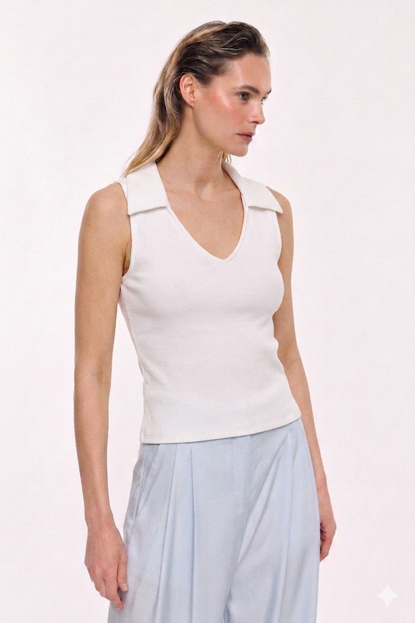 Destaca-se pelo colarinho estruturado, que acrescenta um apontamento elegante e diferenciador, elevando este básico a uma peça mais cuidada e versátil. O corte sem mangas reforça a leveza e torna-o ideal para conjugar tanto em looks descontraídos como em propostas mais sofisticadas.