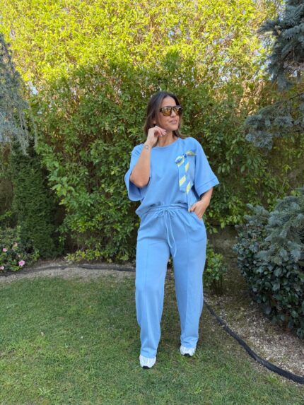 CONJUNTO AZUL COM APLICAÇÃO DE LENÇO MULTICOLOR PONTO CHIC