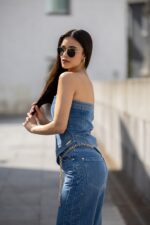 Top assimetrico de decote direito e ombros descobertos. Fecho atrás com fecho de correr metálico. A modelo mede 1,80 m e veste o tamanho S. 100% Algodão