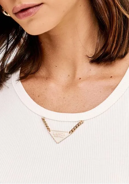 O detalhe de aplicação dourada no decote acrescenta um toque refinado e distintivo, elevando a peça e tornando-a perfeita para looks cuidados sem esforço. O decote redondo e as cavas largas garantem versatilidade e facilidade de conjugação.