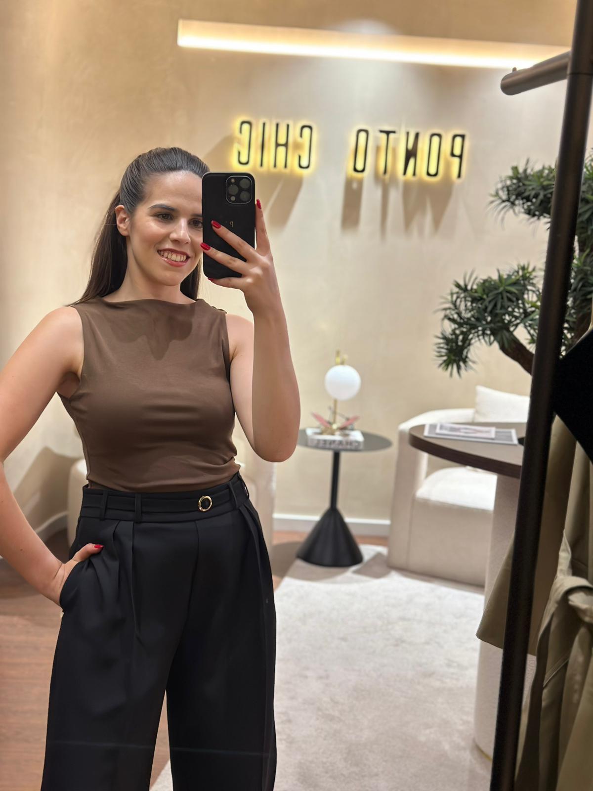 Versátil e intemporal, o top castanho Ponto Chic é perfeito para combinar com tons neutros ou contrastantes — ideal tanto para looks de dia como de noite.