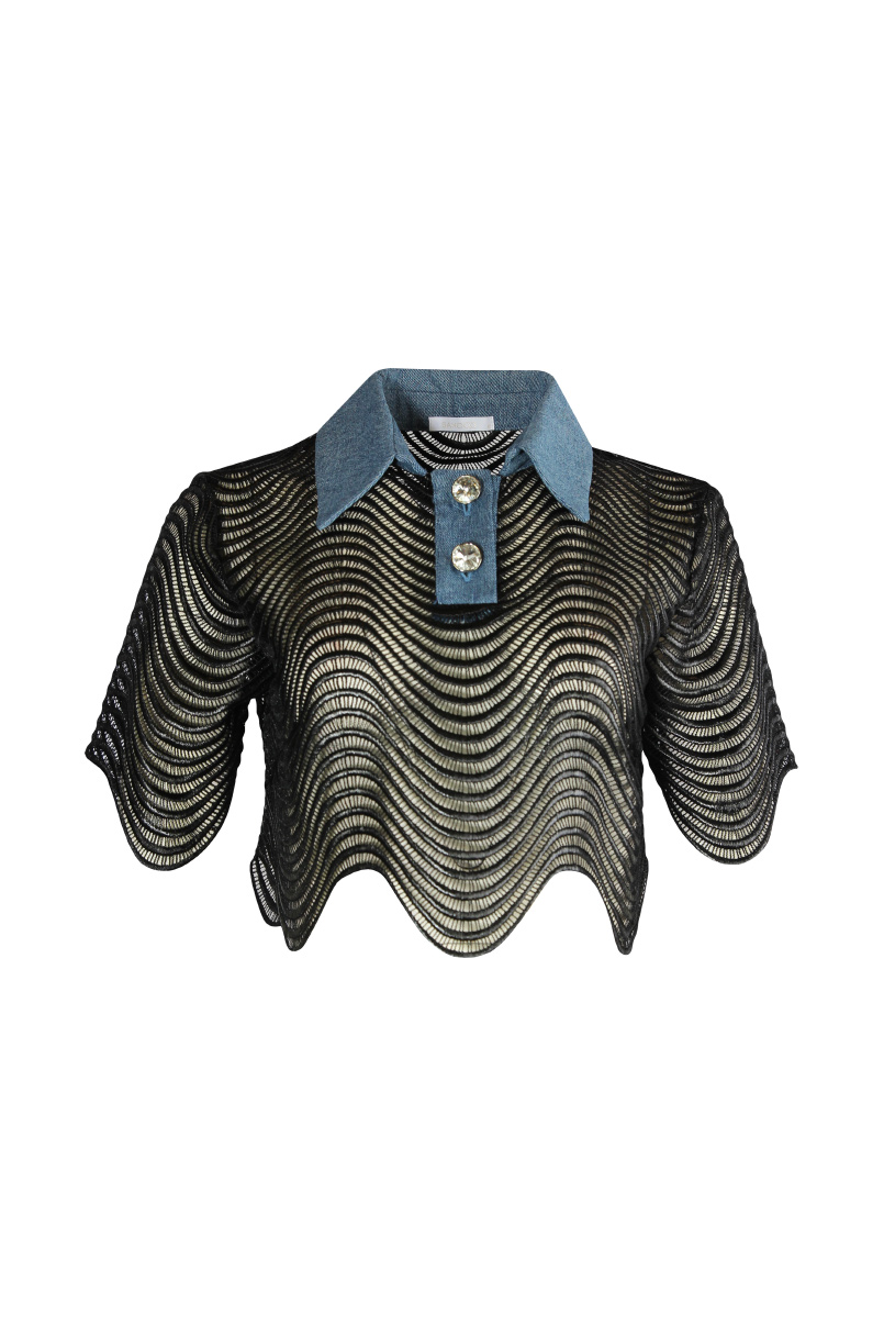 O modelo apresenta uma estrutura em rede preta ondulada, que cria um efeito visual moderno e sensual, deixando a pele subtilmente à mostra. A gola em denim azul acrescenta contraste e originalidade, trazendo um toque urbano e contemporâneo à peça. O corte cropped torna-o ideal para coordenados de impacto, perfeitos para dia e noite.