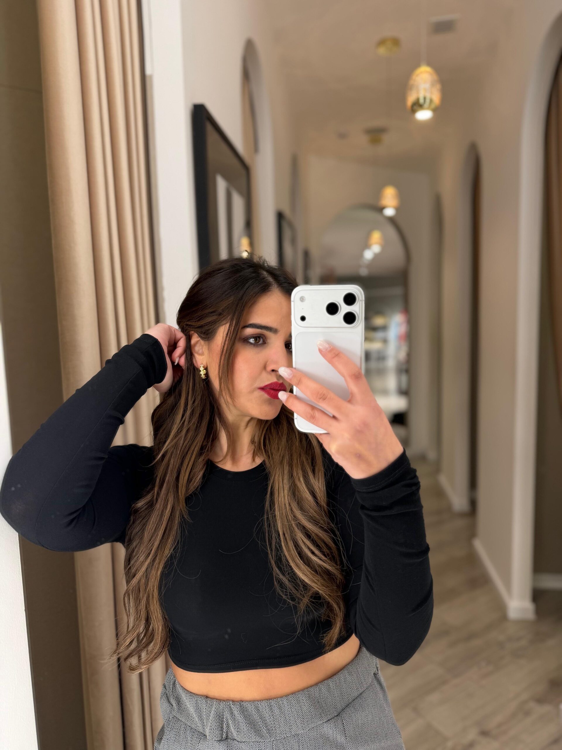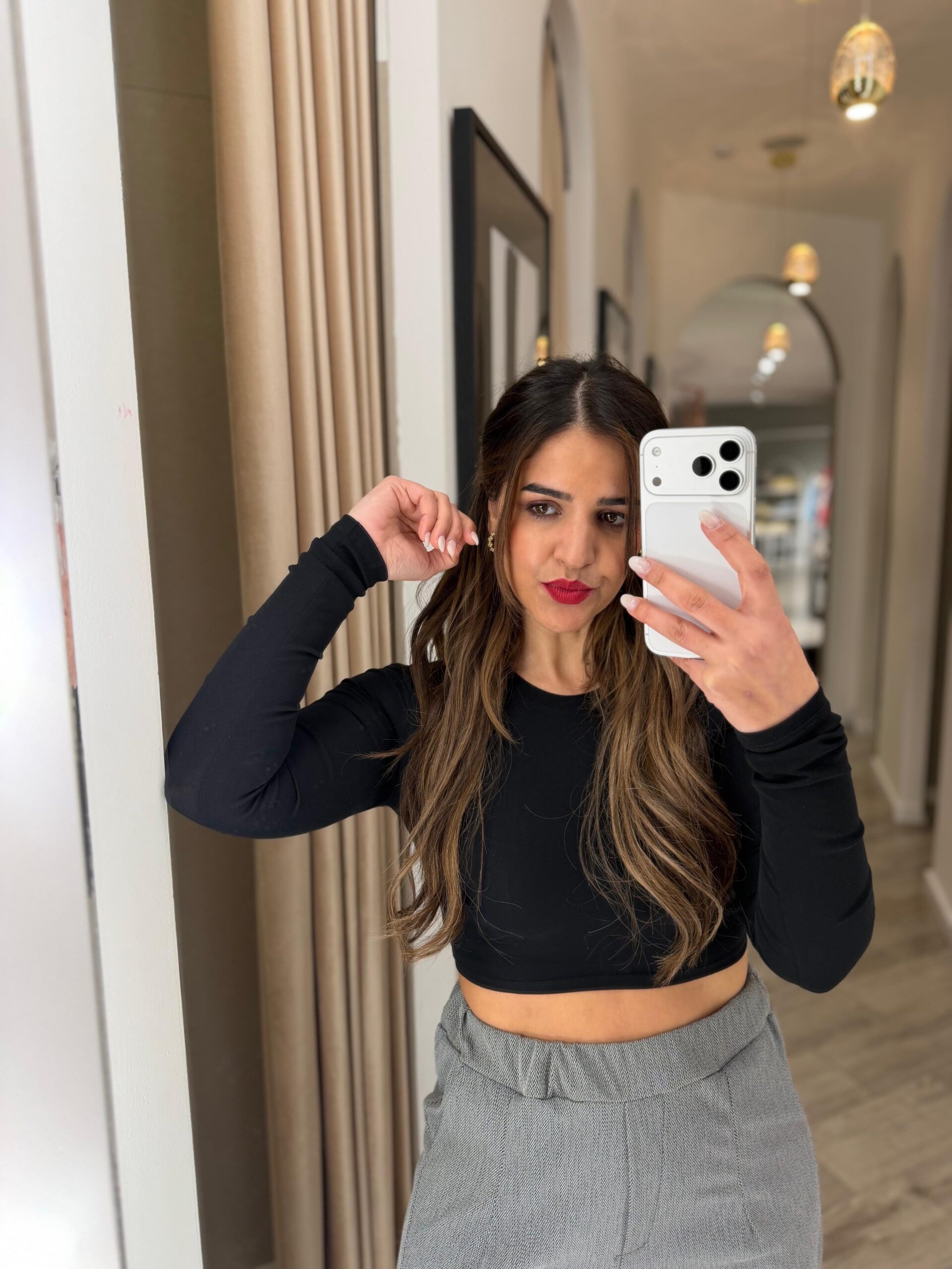 TOP CROPPED PRETO MANGA COMPRIDA PONTO CHIC