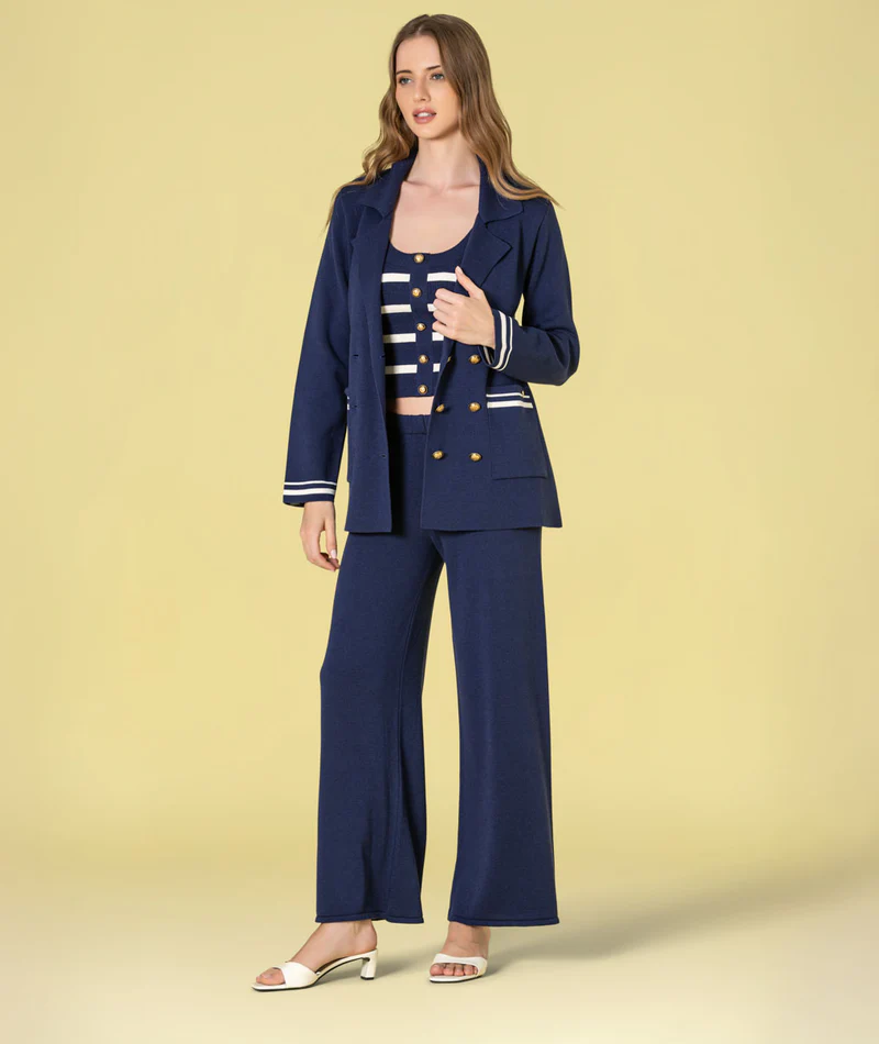 TOP DE MALHA MARINHO ÀS RISCAS COM BOTÕES DOURADOS RUGA