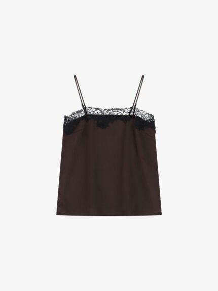 Com alças finas e aplicações de renda preta no decote e na base, este top destaca-se pelo contraste requintado e pela silhueta fluida, inspirada no estilo lingerie chic. Versátil e moderno, é ideal para combinar com calças de alfaiataria, saias lápis ou blazers estruturados, criando looks femininos e contemporâneos.