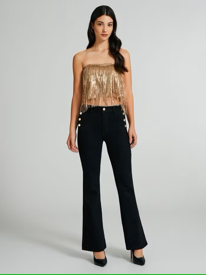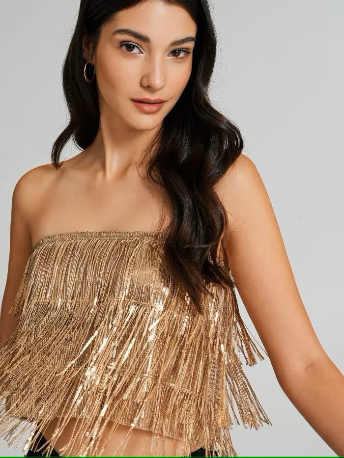 Com design cropped e estrutura cuidadosamente trabalhada, o top ajusta-se de forma perfeita ao corpo, valorizando a silhueta com um toque moderno e sofisticado. O efeito metalizado e o brilho das franjas fazem desta peça uma escolha ousada e refinada para festas e ocasiões especiais.