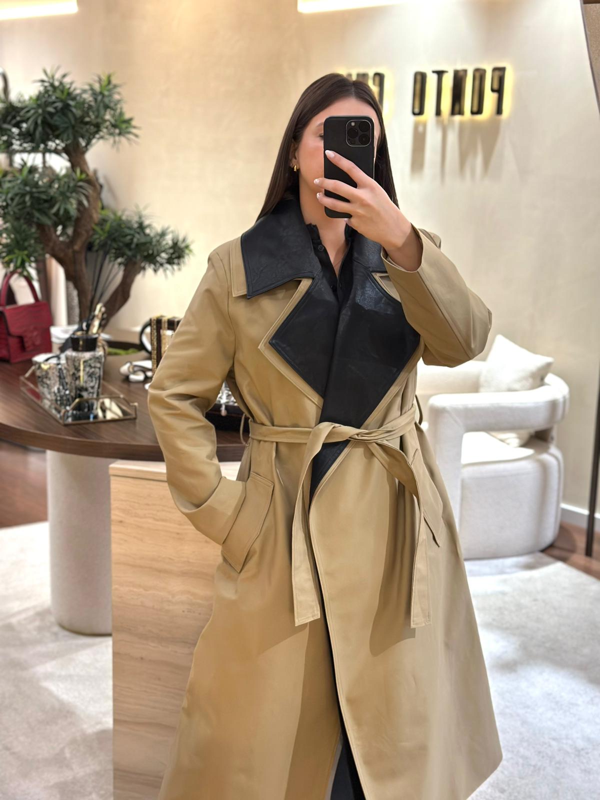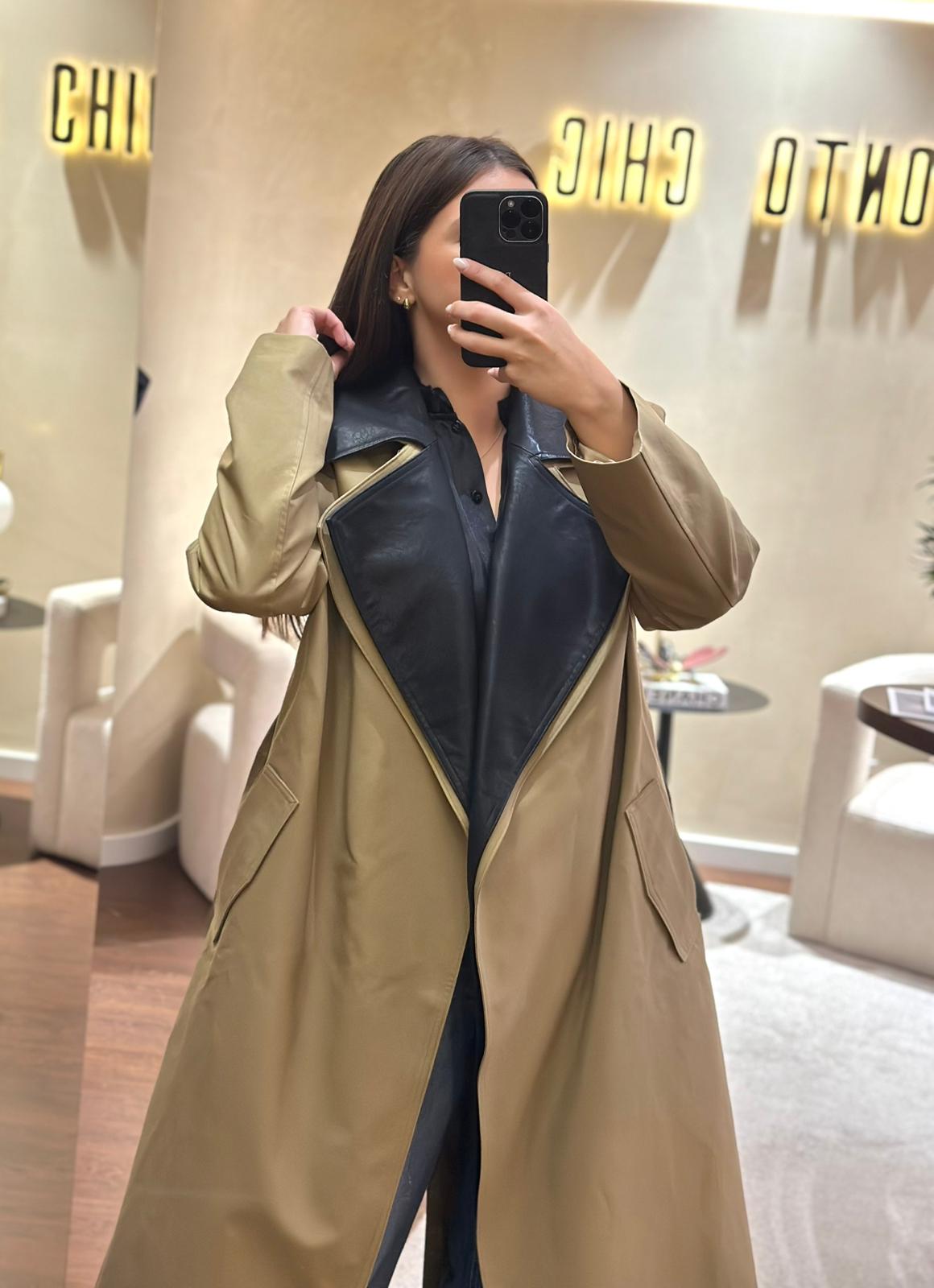O modelo apresenta corte clássico de trench coat com cinto para ajustar a cintura e bolsos práticos. O grande diferencial está na gola oversized em preto contrastante, que acrescenta um toque moderno e arrojado à peça, tornando-a ideal para quem gosta de looks cheios de personalidade.