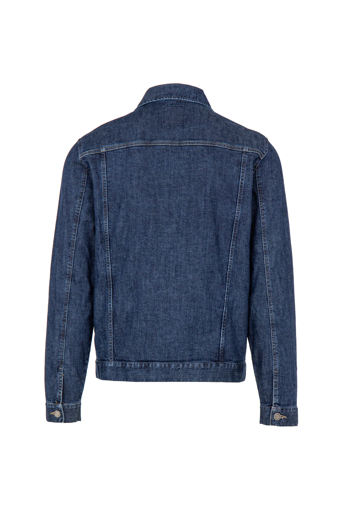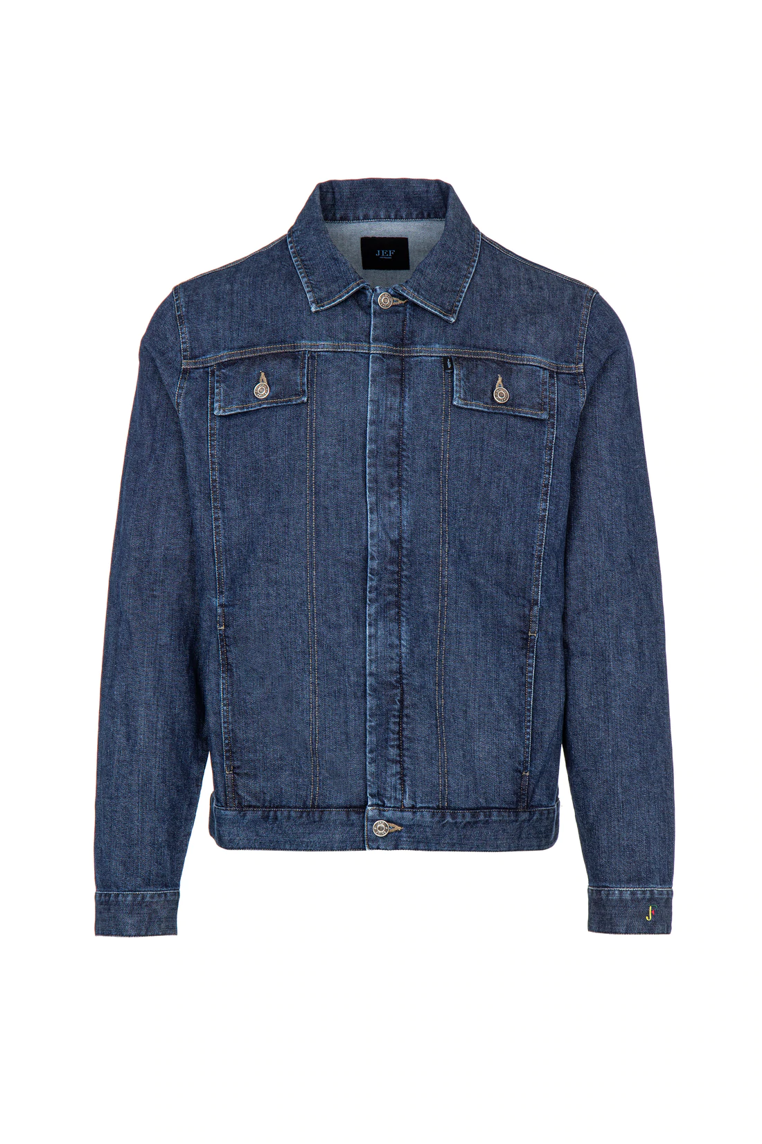Modelo trucker com corte estruturado, gola clássica e fecho frontal com botões. Destaca-se pelos bolsos no peito com aba e botão e pelas costuras contrastantes, que reforçam o seu caráter intemporal e versátil.