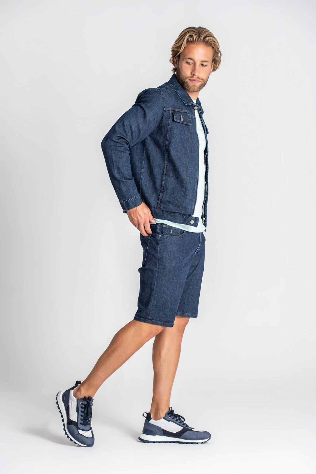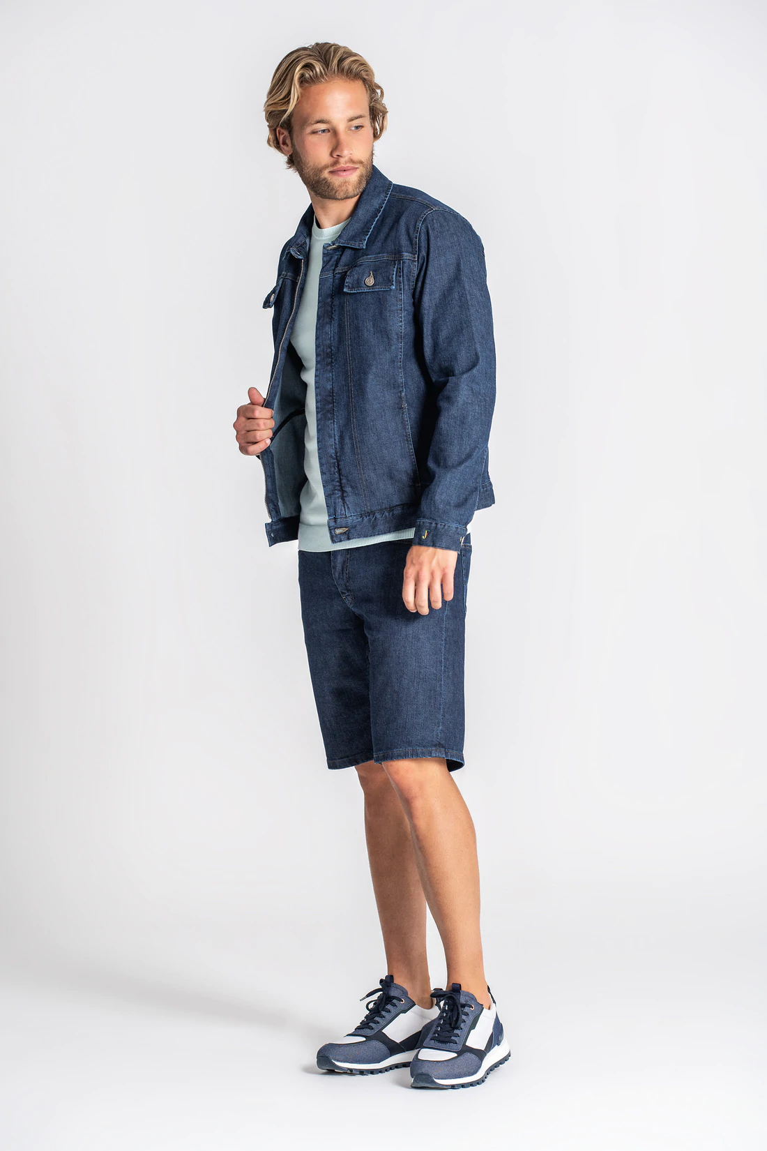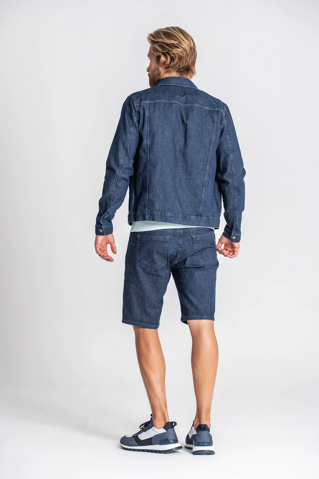 Casaco de ganga em tom azul, confecionado em tecido de elevada qualidade (99% algodão, 1% elastano), que garante conforto, resistência e um leve toque de elasticidade para melhor ajuste ao corpo. Forro em 100% algodão orgânico.