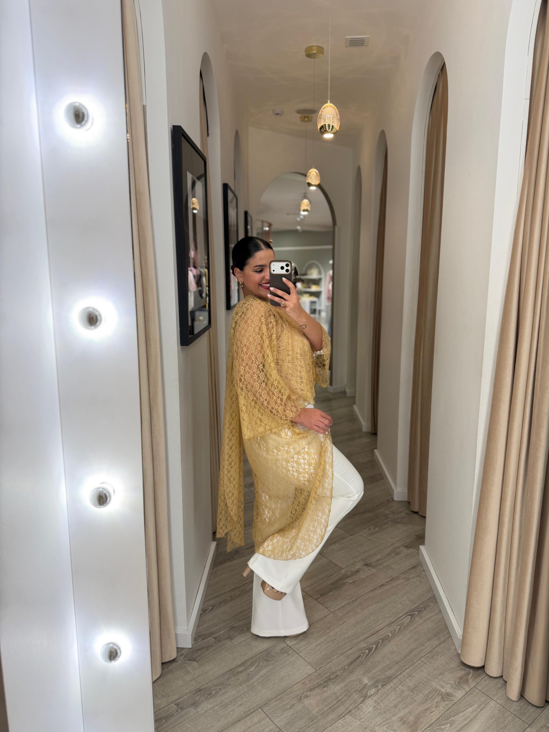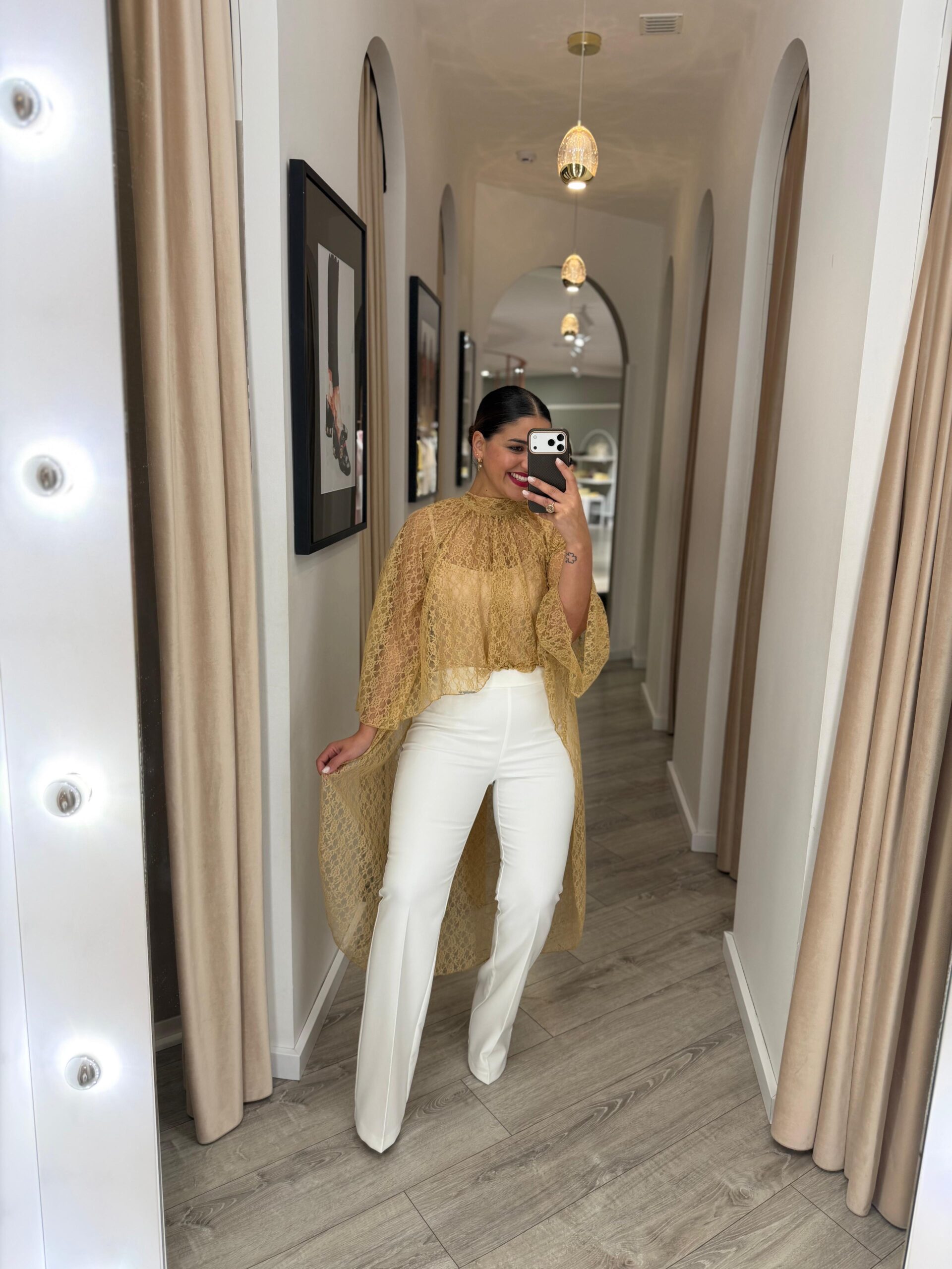 O design destaca-se pela textura rendada com transparência subtil, mangas fluidas e corte solto que cria movimento elegante. O detalhe de laço na zona do decote acrescenta um toque romântico e diferenciador, elevando a peça com suavidade.