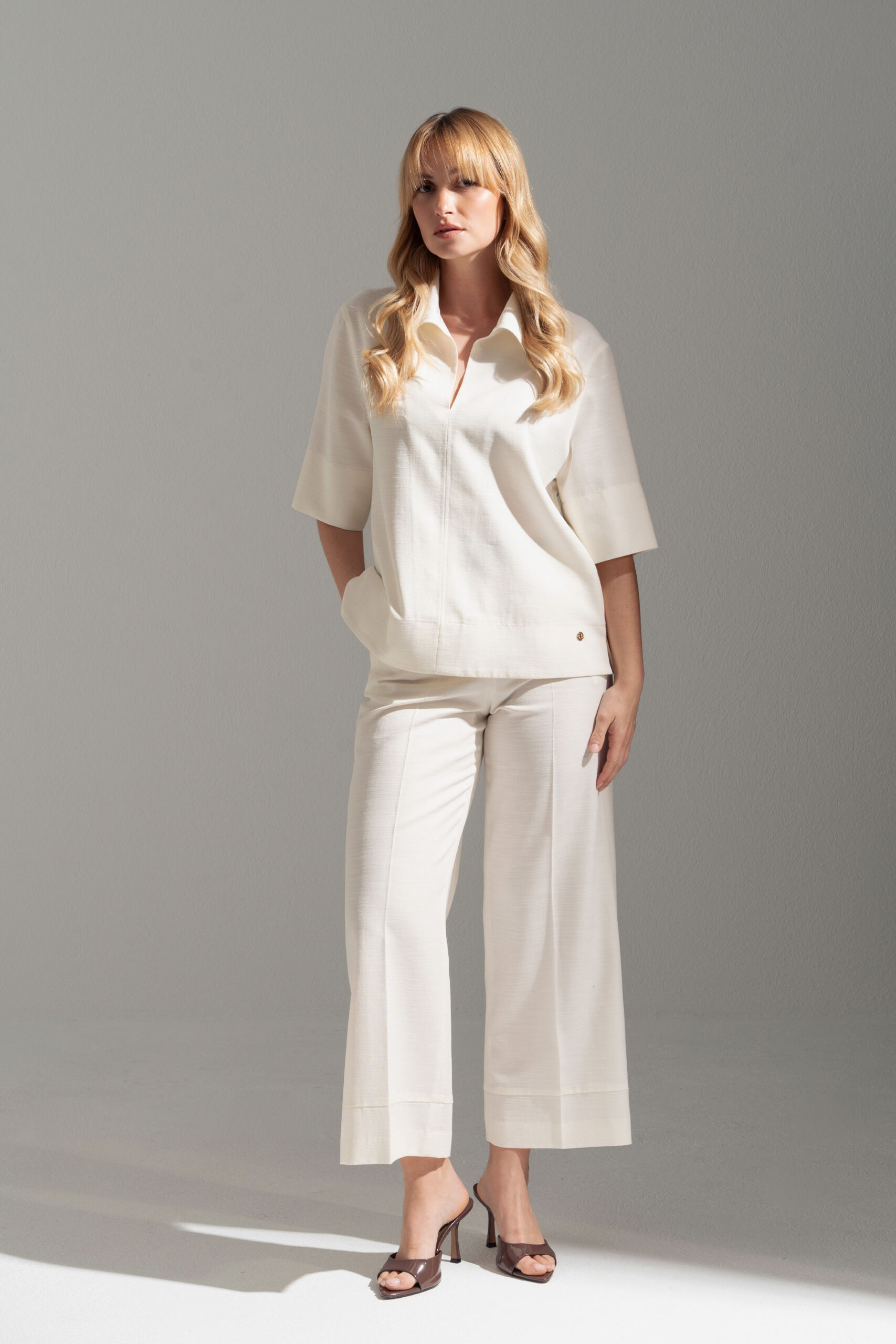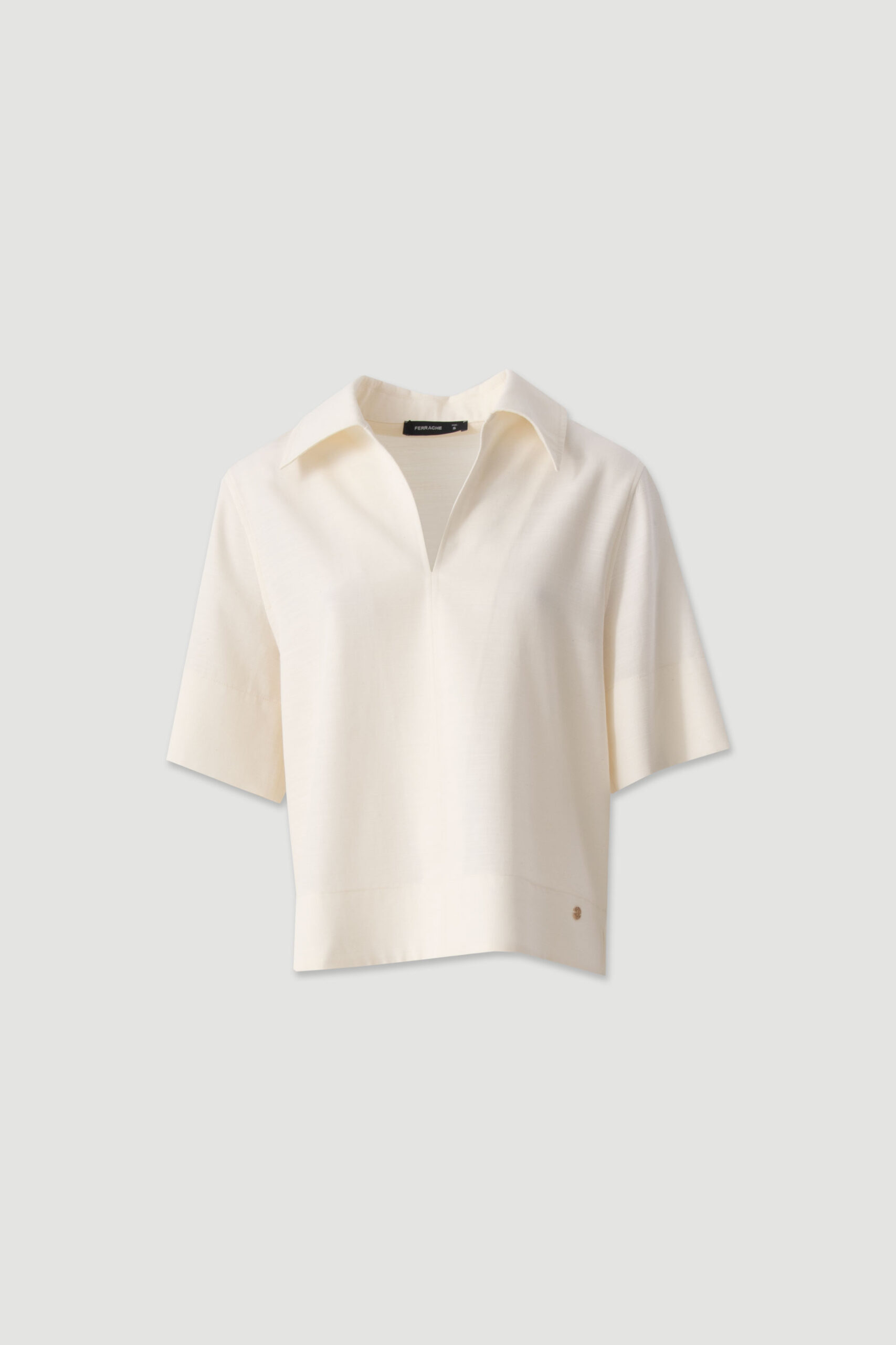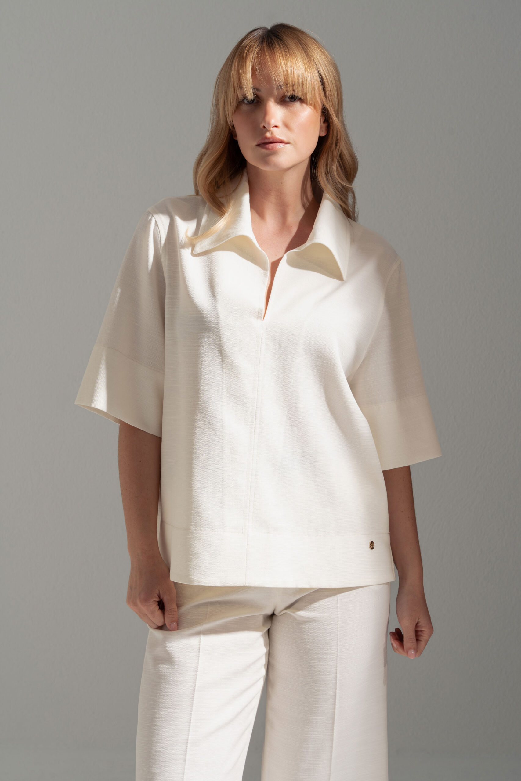 Túnica feminina de design minimalista e elegante, ideal para um look leve e sofisticado. Apresenta colarinho clássico e decote em V discreto, criando uma silhueta clean e feminina. As mangas curtas amplas reforçam o conforto e a fluidez da peça, enquanto o corte solto garante um caimento natural. Confeccionada em mistura de liocel e algodão, oferece suavidade ao toque e frescura, perfeita para os dias mais quentes.