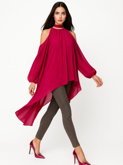 O design destaca-se pela alça com nó decorativo, que acrescenta originalidade, e pela manga comprida com punho elástico, que garante movimento e charme. O cinto permite marcar a silhueta e adaptar o styling conforme a ocasião, valorizando a feminilidade.