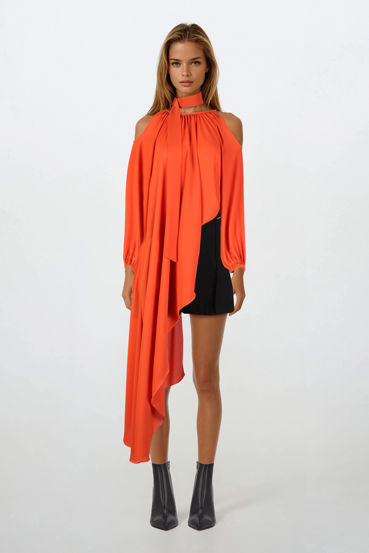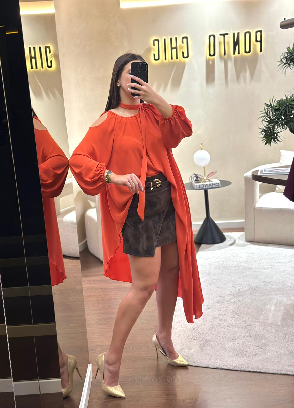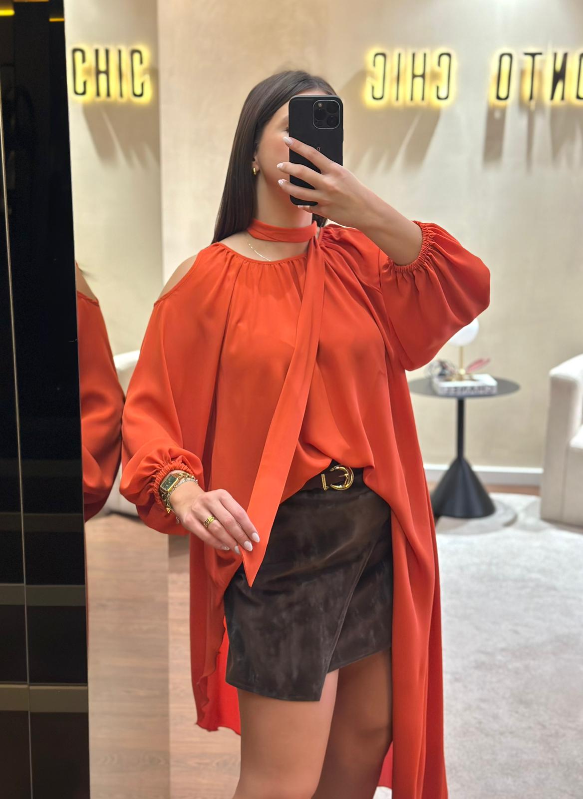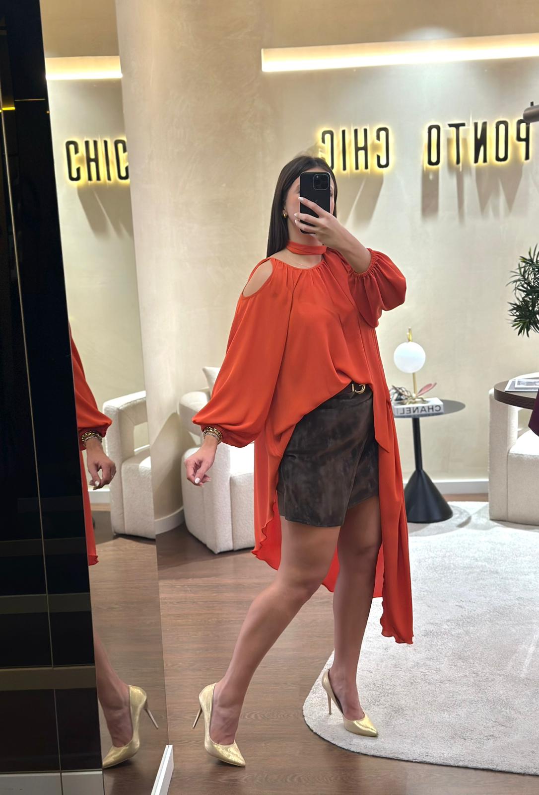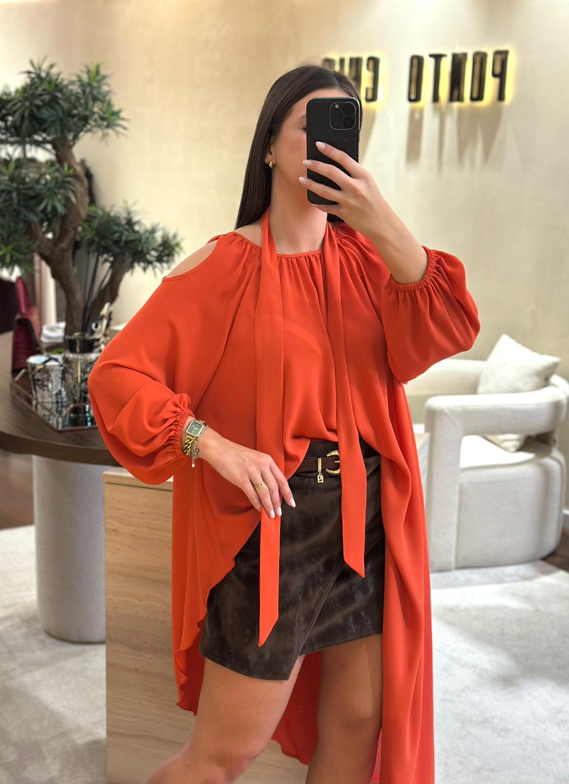 A túnica laranja Sahoco é uma peça marcante que une fluidez e sofisticação. Confeccionada em 100% poliéster, oferece leveza, conforto e um cair elegante, tornando-se perfeita para looks modernos e distintos.