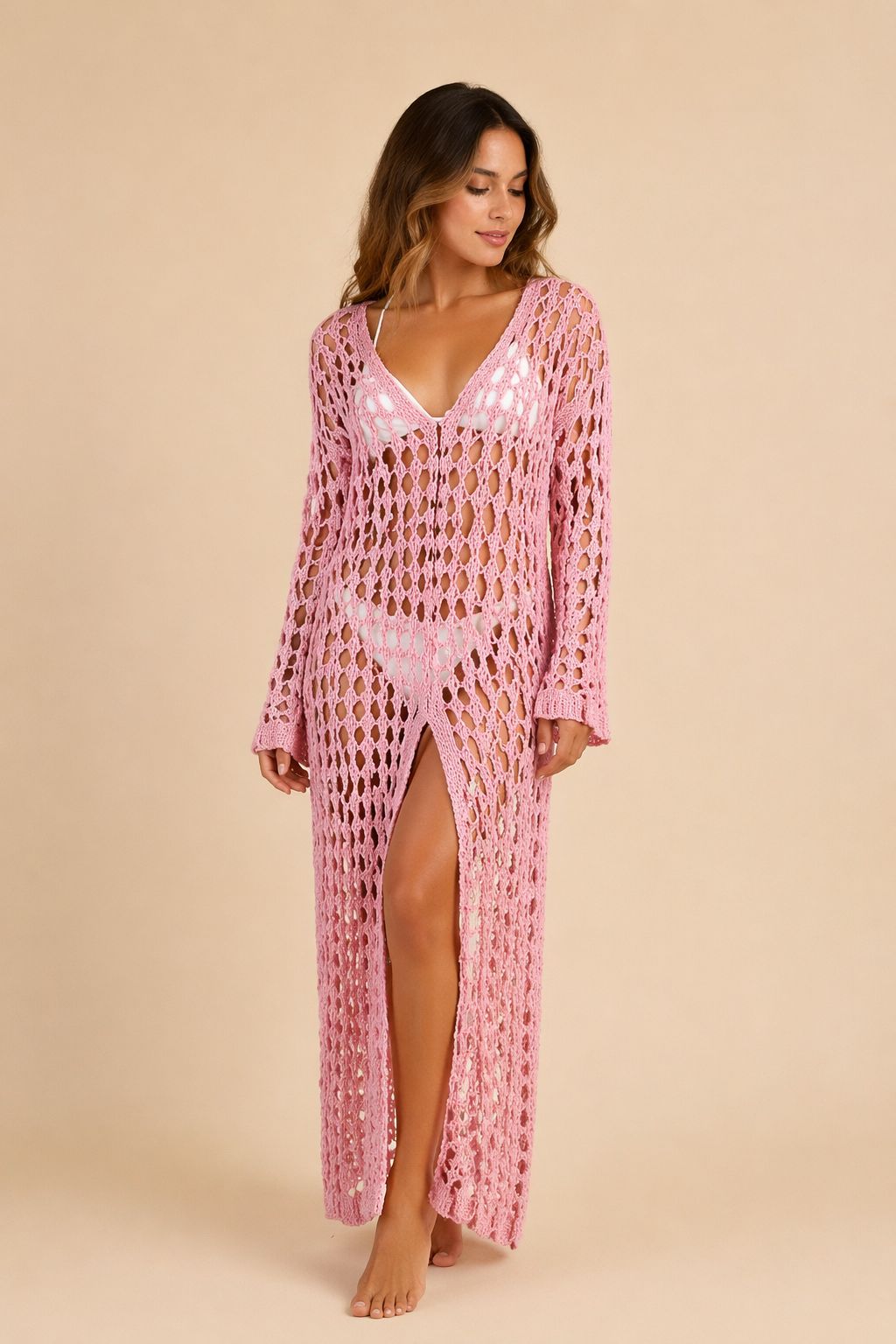 Túnica longa em malha crochet rosa, com uma textura vazada delicada que confere leveza e sofisticação ao look. Produzida em Itália com uma composição de 50% algodão e 50% acrílico, garante conforto, respirabilidade e um toque suave ideal para os dias mais quentes.