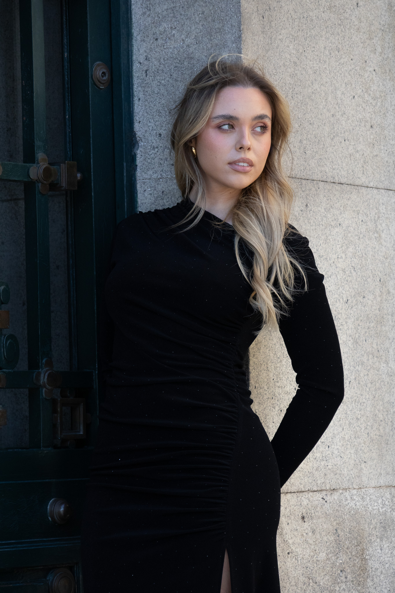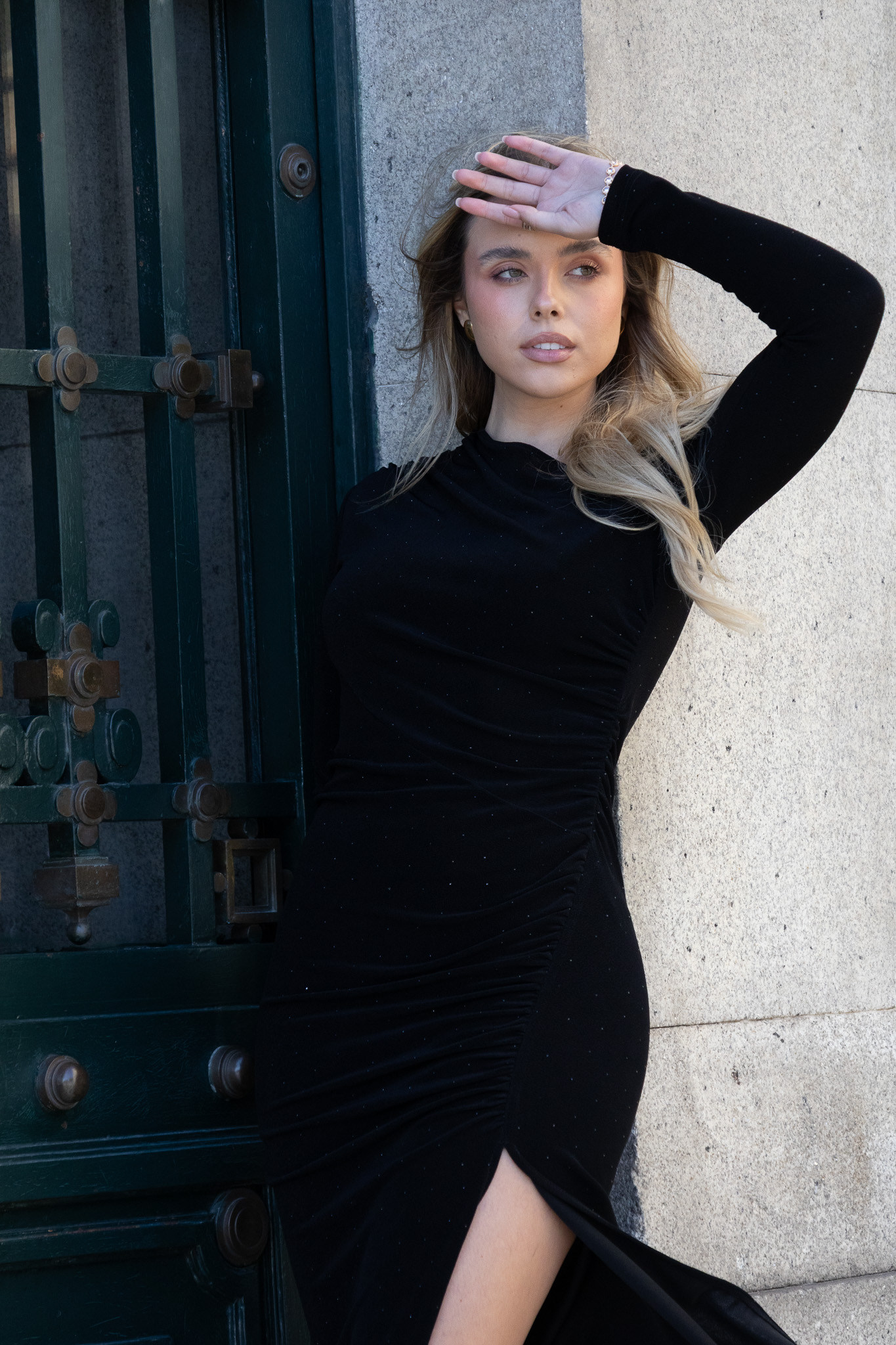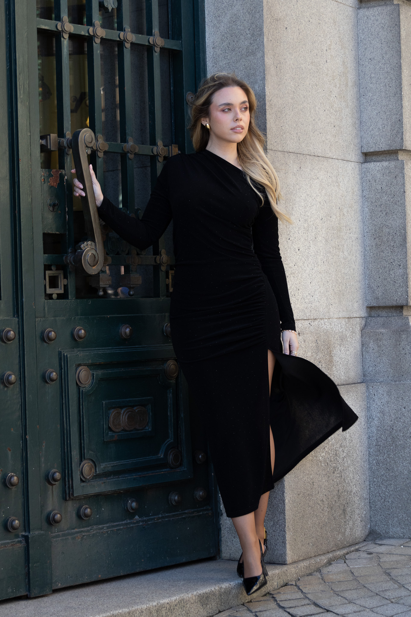 A estrutura drapeada na zona do corpo favorece a figura, criando linhas elegantes e valorizando a zona da cintura. O comprimento midi reforça a sofisticação, garantindo um visual refinado e intemporal.
