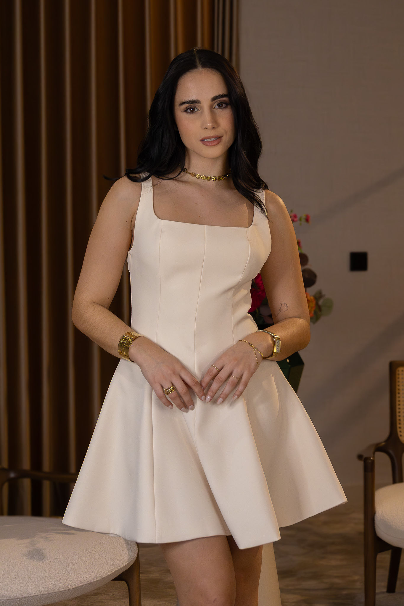 Vestido bege de design estruturado e estética sofisticada, inspirado na silhueta corset, que valoriza a forma do corpo de maneira elegante, feminina e contemporânea. O decote reto com alças largas cria um visual equilibrado entre sensualidade subtil e elegância moderna, garantindo suporte visual e um encaixe harmonioso no tronco.