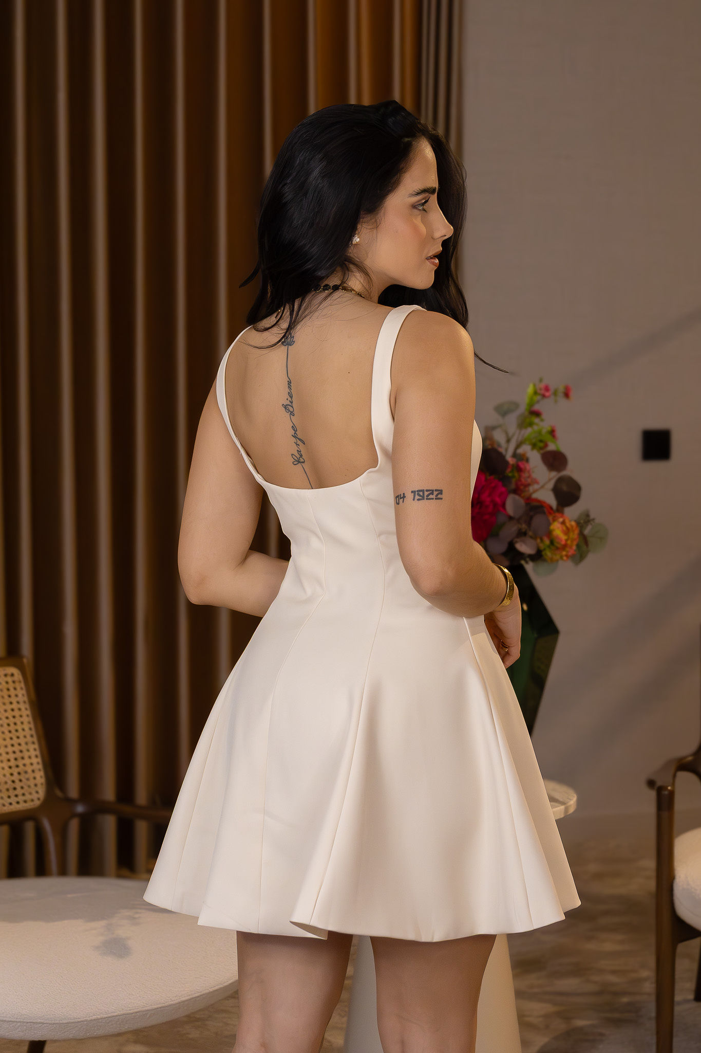 A construção ajustada na parte superior, com costuras verticais estruturais, define a silhueta e realça a cintura, enquanto a saia com abertura em efeito peplum fluido confere movimento, leveza e feminilidade ao conjunto. O contraste entre estrutura e fluidez cria uma peça forte, sofisticada e altamente favorecedora.