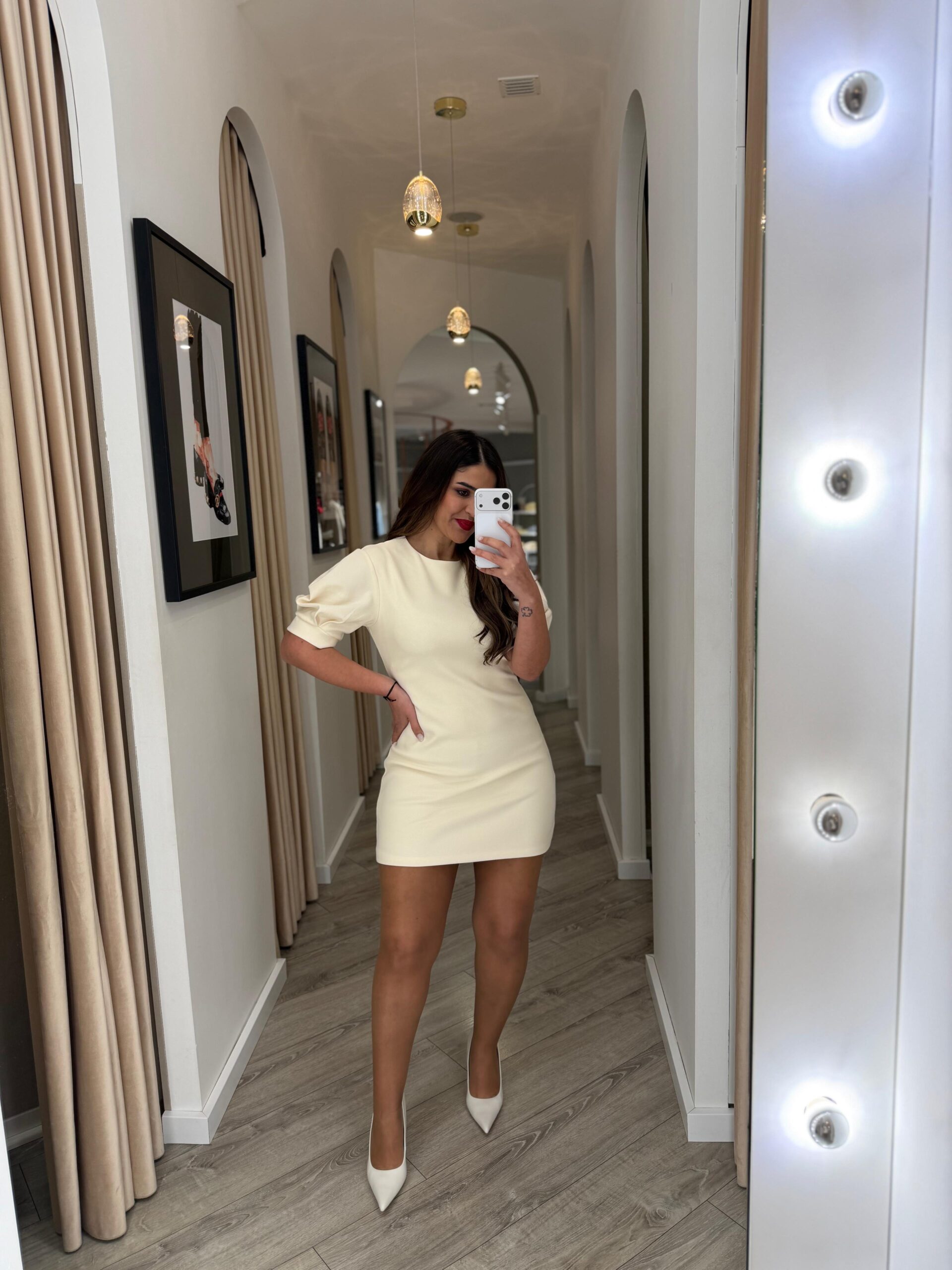 Vestido em tom bege de linhas minimalistas e elegantes, pensado para uma silhueta sofisticada e intemporal. O design clean é valorizado pelas mangas curtas estruturadas com pregas subtis e punho largo, que acrescentam volume e presença à peça, conferindo-lhe um toque contemporâneo e refinado.
