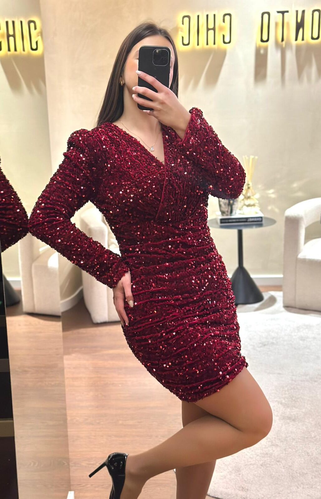 VESTIDO BORDEAUX CURTO COM LANTEJOULAS PONTO CHIC