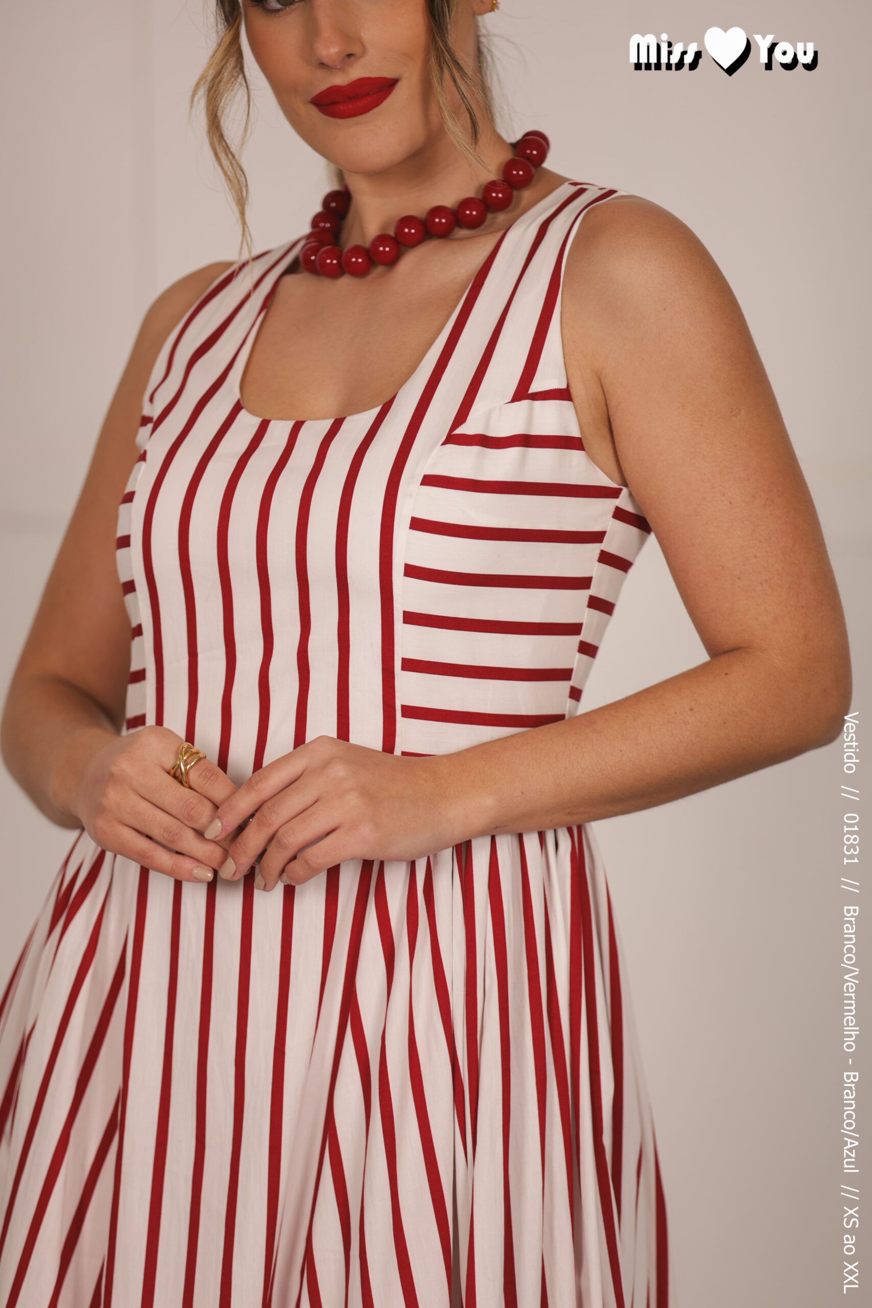 Vestido branco Miss You com padrão de riscas vermelhas, confeccionado em 100% algodão, garantindo leveza, respirabilidade e conforto ao longo do dia. O tecido natural torna-o ideal para dias mais quentes.