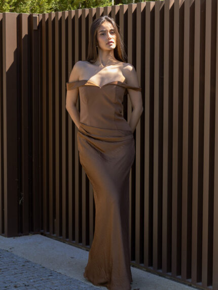VESTIDO COMPRIDO CRU COM DRAPEADO E APLICAÇÃO DOURADA RINASCIMENTO