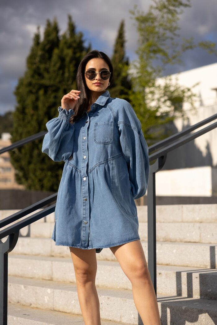 Vestido camiseiro em ganga. Bolsos chapa na frente. Gola camiseiro. Abotoa na frente com mola em formato de coração. Manga comprida com elásticos no fundo a formar folho. Composição: 86.7% Algodão 8.2% Viscose 5.1% Poliéster