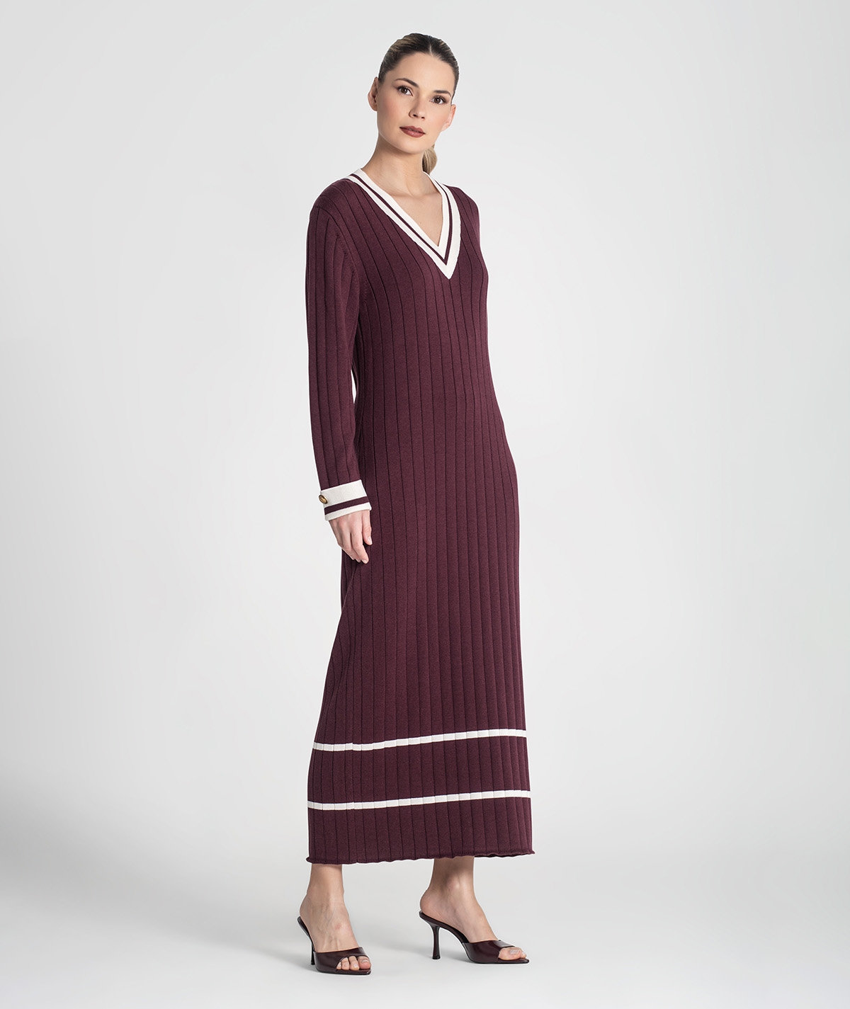 VESTIDO CANELADO BORDEAUX COM CONTRASTE EM ALGODÃO RUGA