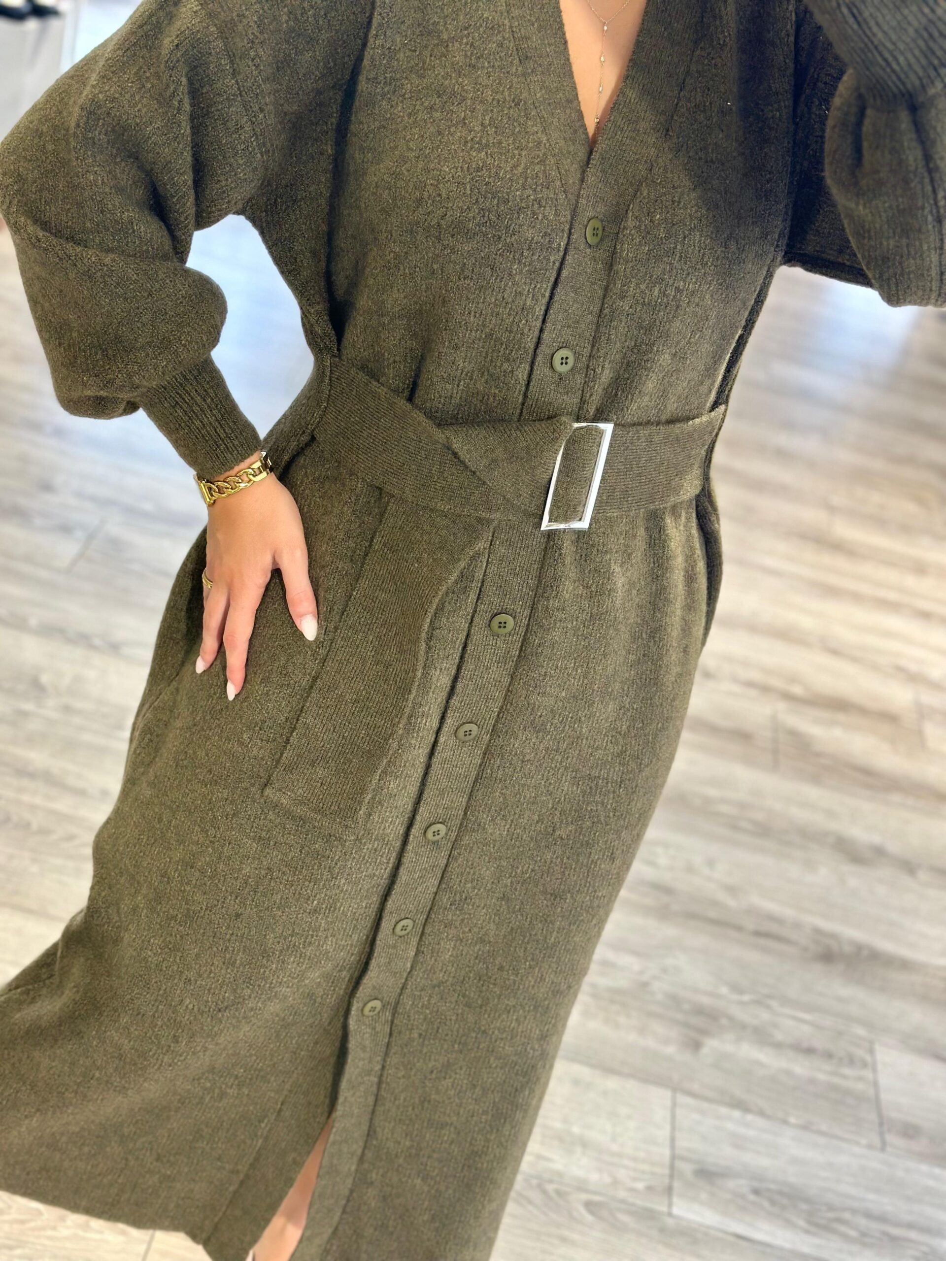 VESTIDO CASACO KAKI COM CINTO E MANGAS ABALONADAS RUGA