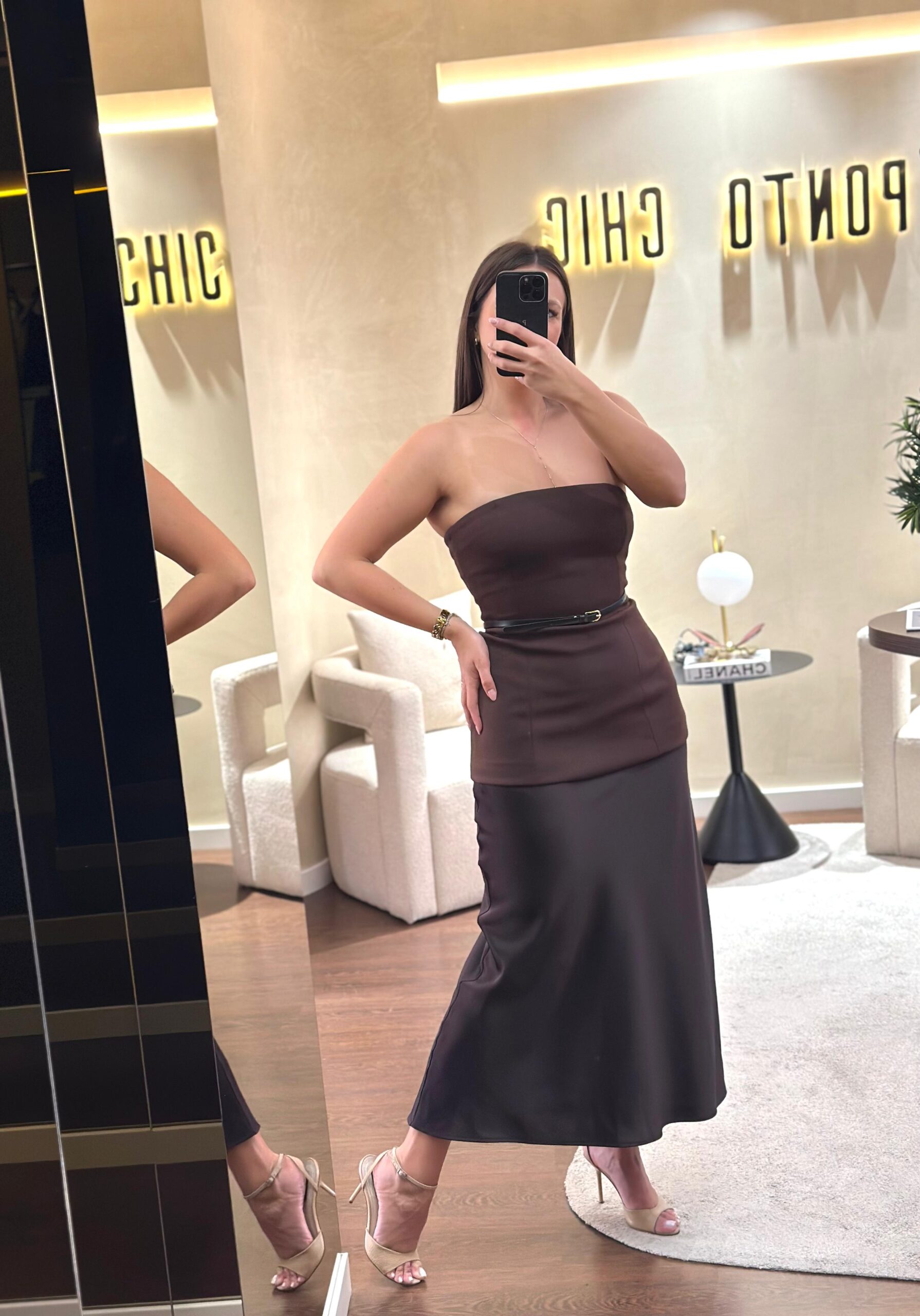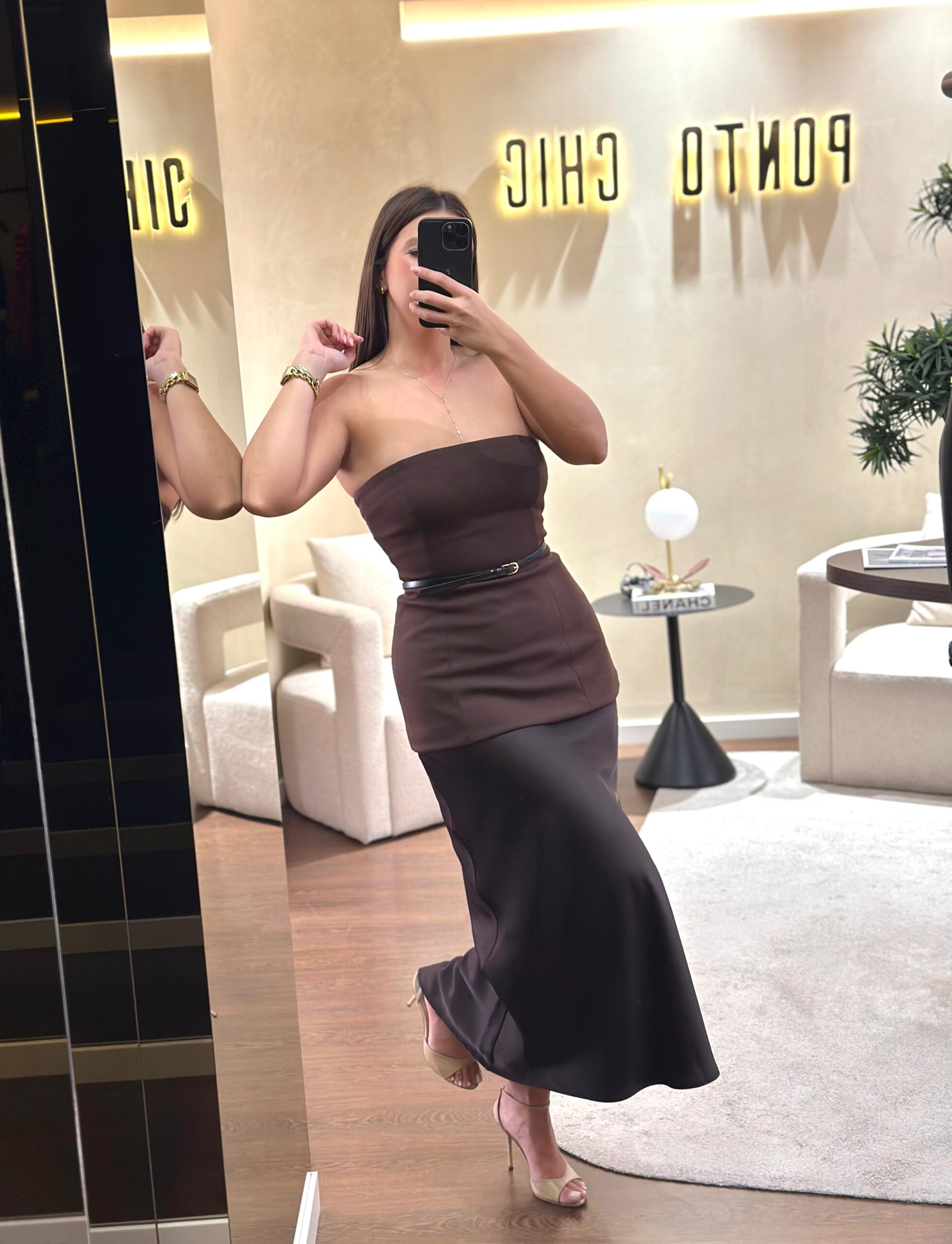 Com corte tomara-que-caia estruturado e caimento fluído na saia comprida, esta peça equilibra sensualidade e elegância, tornando-se perfeita para ocasiões especiais, desde jantares sofisticados a eventos formais. O fecho discreto nas costas garante praticidade sem perder a harmonia do design.