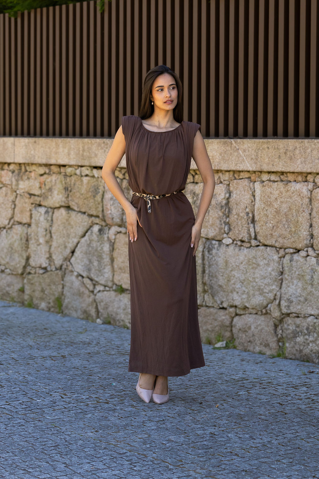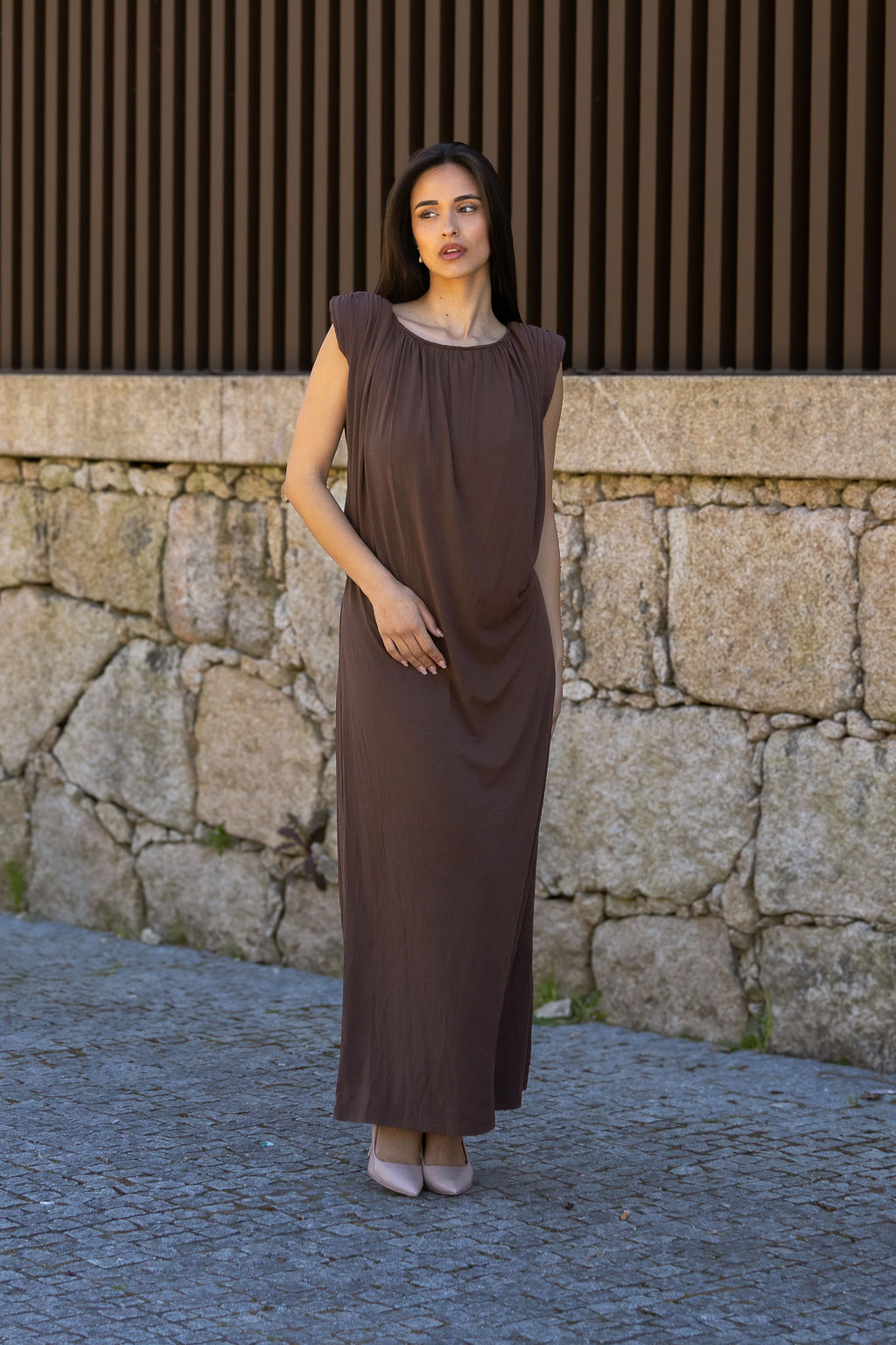 Este vestido em tom castanho destaca-se pela sua fluidez e elegância descontraída, sendo uma peça que alia conforto e sofisticação de forma natural. Confeccionado em tecido leve e suave (65% modal e 35% nylon), apresenta um toque macio e um caimento fluido que acompanha o movimento do corpo.