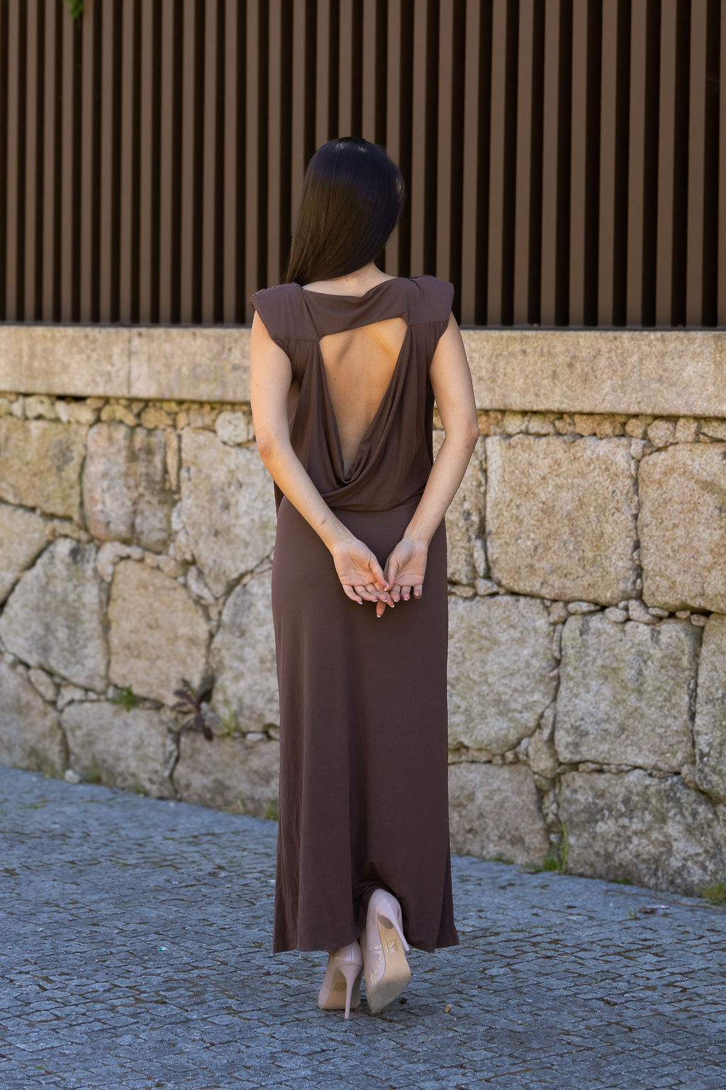 VESTIDO CASTANHO COM ABERTURA DRAPEADA NAS COSTAS IMPERIAL