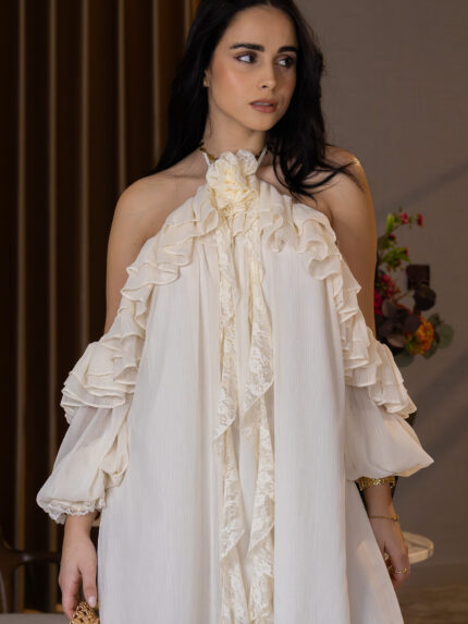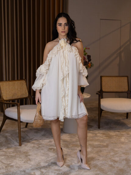 Com corte confortável e feminino, este vestido adapta-se à silhueta com naturalidade, garantindo um visual elegante tanto para festas como para jantares especiais. Um modelo versátil, charmoso e cheio de presença — fiel à essência chic da marca.