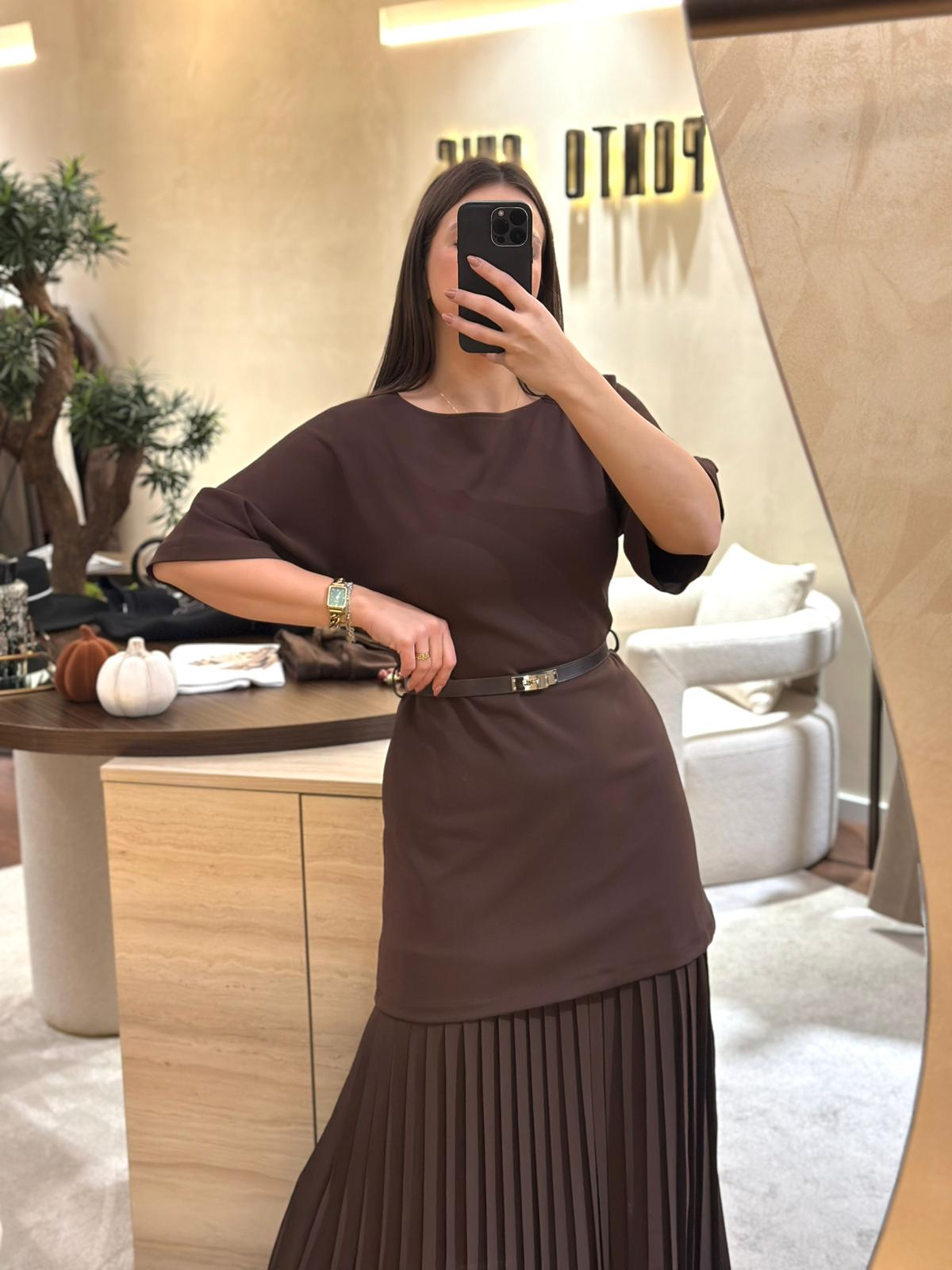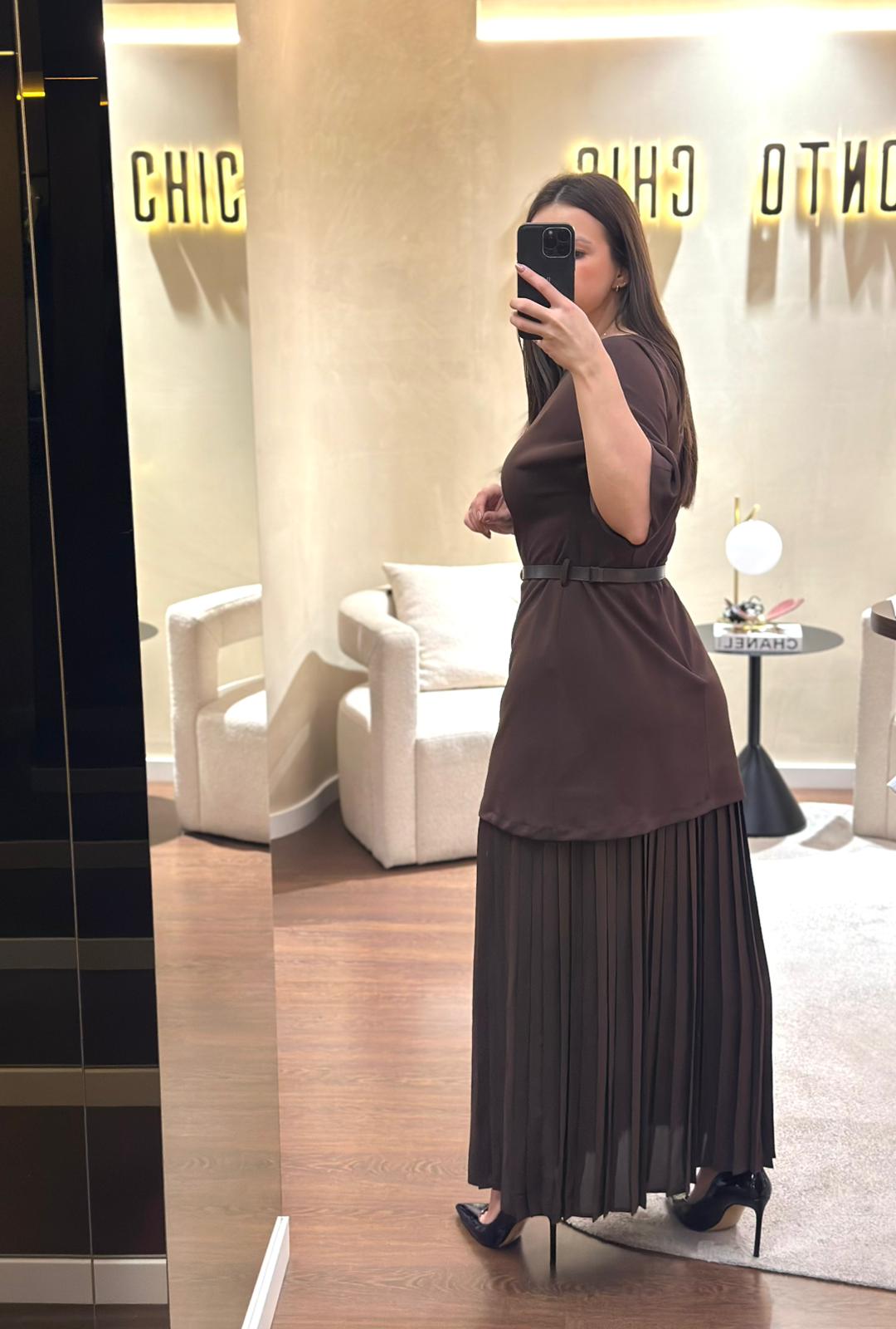 VESTIDO CASTANHO COM CINTO E SAIA PLISSADA IMPERIAL